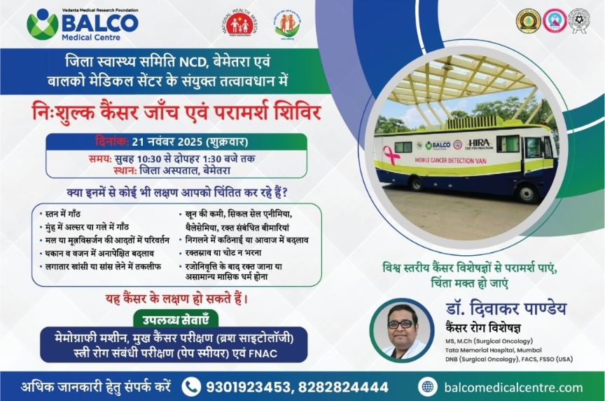 जिला चिकित्सालय बेमेतरा में 21 नवम्बर, शुक्रवार को निःशुल्क कैंसर जांच और परामर्श शिविर आयोजित किया जाएगा। इस शिविर में बालको मेडिकल सेंटर, नया रायपुर के विशेषज्ञ डॉक्टरों की टीम नागरिकों को जांच और परामर्श सेवाएं प्रदान करेगी। शिविर का समय प्रातः 10:30 बजे से दोपहर 1:30 बजे तक निर्धारित है।कलेक्टर रणबीर शर्मा और सीएमएचओ डॉ. अमृत लाल रोहलेडर के निर्देशानुसार, सिविल सर्जन डॉ. लोकेश साहू के मार्गदर्शन में यह शिविर आयोजित किया जा रहा है।