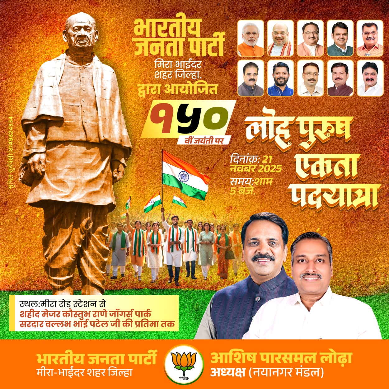 भाजपा द्वारा मीरा रोड स्टेशन से पूनम सागर तक एकता पद यात्रा आयोजित की गई है आज 21 नवम्बर 2025 शाम ठीक 5 बजे,