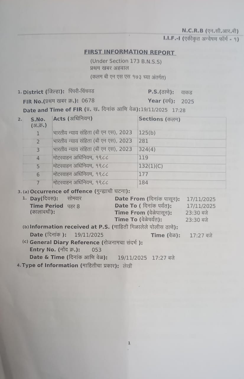 рдлрд┐рд░реНрдпрд╛рджреА рджреНрд╡рд╛рд░рдХрд╛рдирд╛рде рд╢рд┐рдВрджреЗ рдпрд╛рдВрдЪреНрдпрд╛ рддрдХреНрд░рд╛рд░реАрд╡рд░реВрди рд╡рд╛рдХрдб рдкреЛрд▓рд┐рд╕рд╛рдВрдиреА рдЖрд░реЛрдкреА рдЪрд╛рд▓рдХрд╛рд╡рд░ рднрд╛рд░рддреАрдп рдиреНрдпрд╛рдп рд╕рдВрд╣рд┐рддрд╛ 2023 рд╡ рдореЛрдЯрд╛рд░ рд╡рд╛рд╣рди рдХрд╛рдпрджрд╛ рдЕрдВрддрд░реНрдЧрдд рдЧреБрдиреНрд╣реЗ рдиреЛрдВрджрд╡рд▓реЗ рдЖрд╣реЗрдд.