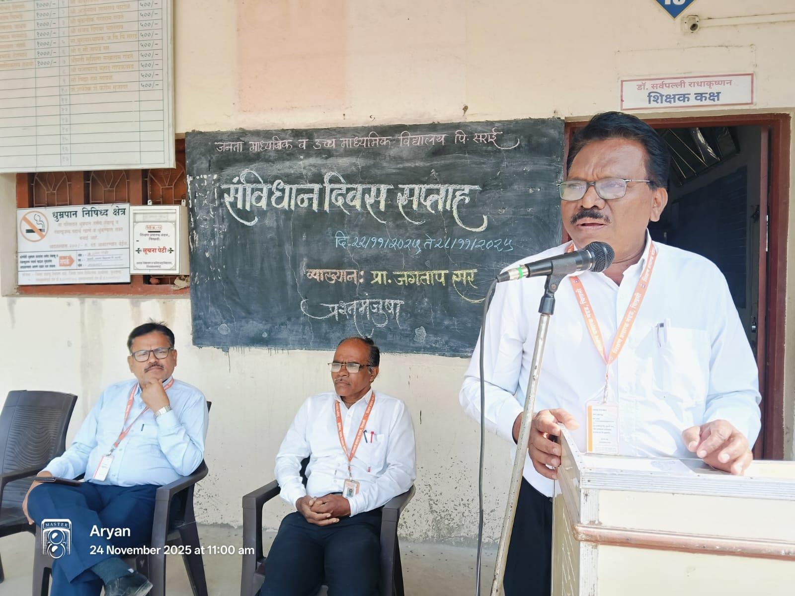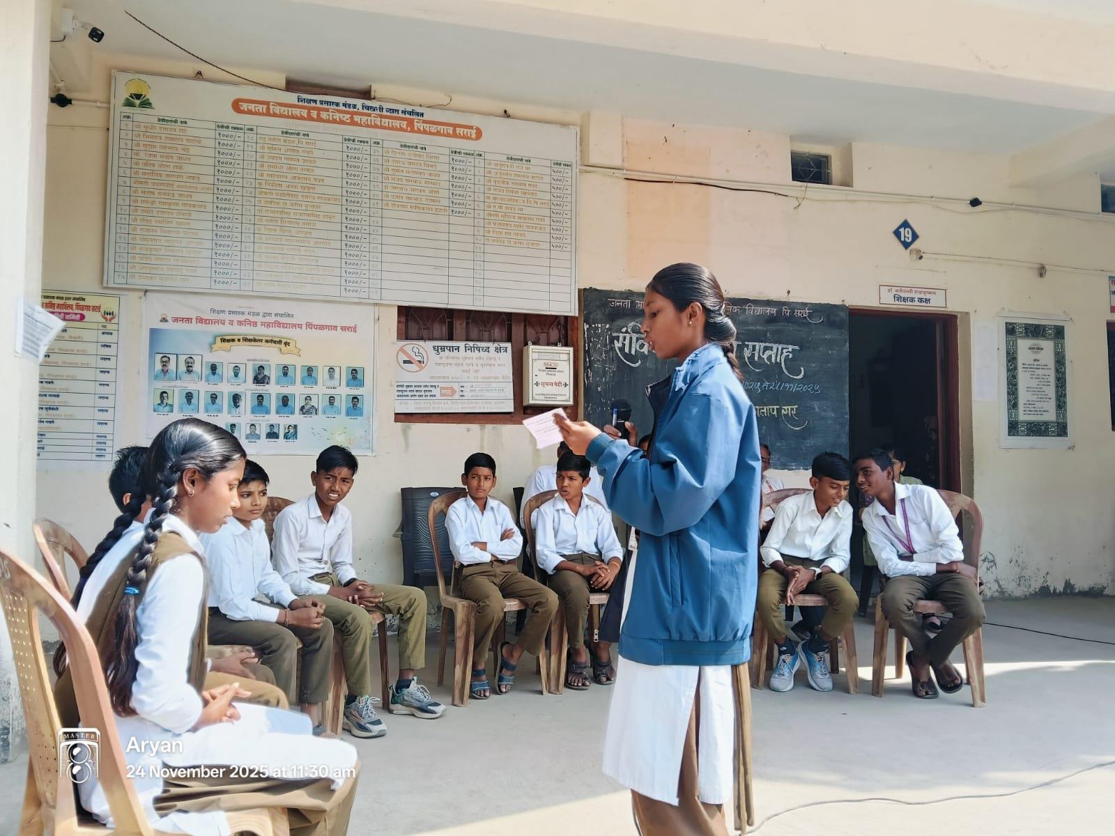 जनता विद्यालय पिंपळगाव सराई येथे संविधान दिन सप्ताहानिमित्त दि. २४ नोव्हेंबर २०२५ रोजी विविध उपक्रमांचे आयोजन करण्यात आले. कार्यक्रमास प्राचार्य प्रमोद ठोंबरे अध्यक्ष म्हणून उपस्थित होते. या प्रसंगी त्यांनी प्रश्नमंजुषा स्पर्धेत सहभागी झालेल्या विद्यार्थ्यांचे कौतुक करताना, “विद्यार्थ्यांनी संविधानाविषयी दाखवलेली जिज्ञासा, तयारी आणि आत्मविश्वास उल्लेखनीय आहे. अशा स्पर्धांमुळे विचारशक्ती, लोकशाही मूल्यांची जाण आणि राष्ट्रीय बांधिलकी दृढ होते,” अशी प्रशंसनीय भावना व्यक्त केली.