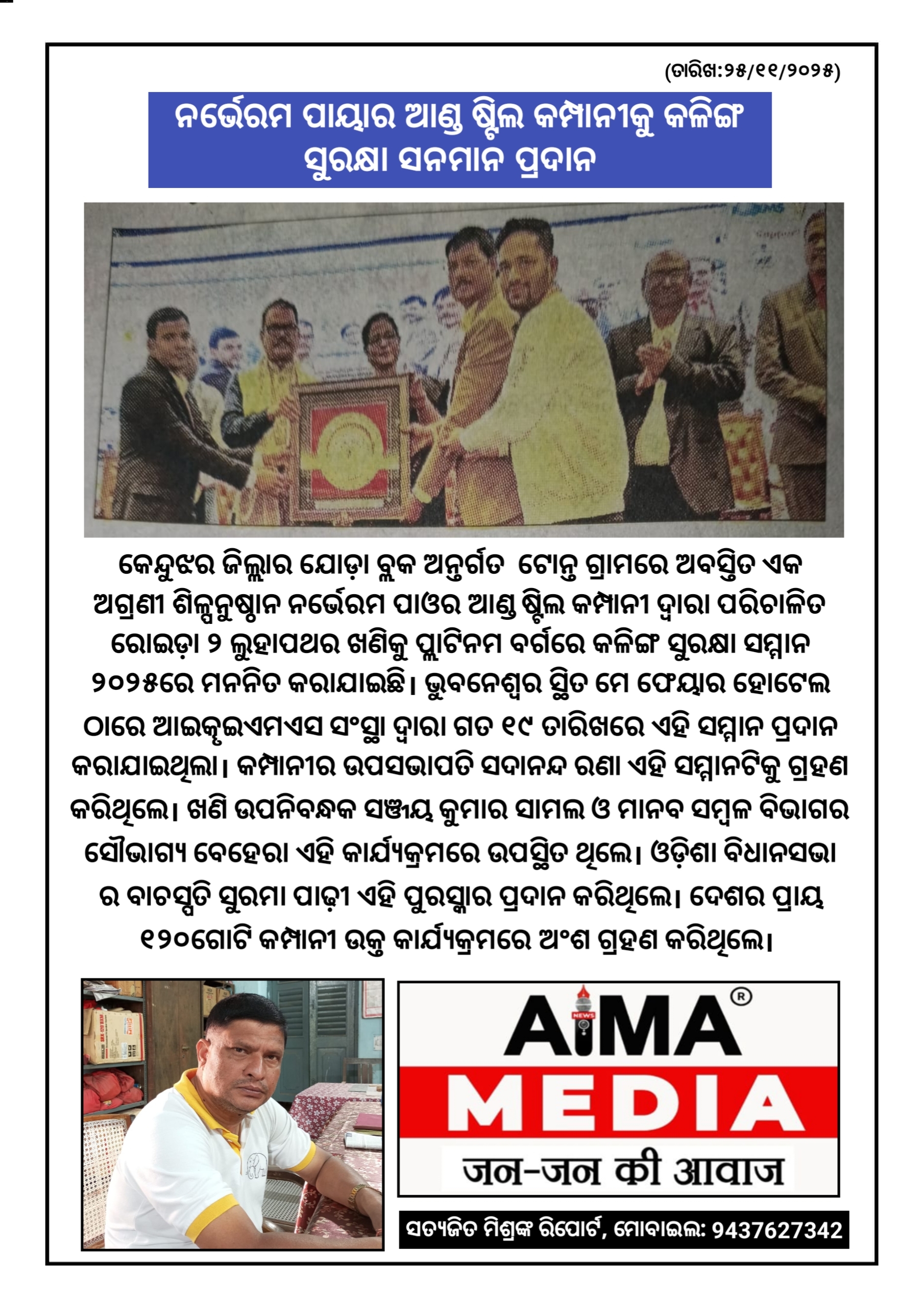କେନ୍ଦୁଝର ଜିଲ୍ଲାର ଯୋଡ଼ା ବ୍ଲକ ଅନ୍ତର୍ଗତ ଟୋନ୍ତ ଗ୍ରାମରେ ଅବସ୍ତିତ ଏକ ଅଗ୍ରଣୀ ଶିଳ୍ପନୁଷ୍ଠାନ ନର୍ଭେରମ ପାଓର ଆଣ୍ଡ ଷ୍ଟିଲ କମ୍ପାନୀ ଦ୍ୱାରା ପରିଚାଳିତ ରୋଇଡ଼ା ୨ ଲୁହାପଥର ଖଣିକୁ ପ୍ଲାଟିନମ ବର୍ଗରେ କଳିଙ୍ଗ ସୁରକ୍ଷା ସମ୍ମାନ ୨୦୨୫ରେ ସମ୍ମାନିତ କରାଯାଇଛି। ଭୁବନେଶ୍ୱର ସ୍ଥିତ ମେ ଫେୟାର ହୋଟେଲ ଠାରେ ଆଇକୄଇଏମଏସ ସଂସ୍ଥା ଦ୍ୱାରା ଗତ ୧୯ ତାରିଖରେ ଏହି ସମ୍ମାନ ପ୍ରଦାନ କରାଯାଇଥିଲା। କମ୍ପାନୀର ଉପସଭାପତି ସଦାନନ୍ଦ ରଣା ଏହି ସମ୍ମାନଟିକୁ ଗ୍ରହଣ କରିଥିଲେ। ଖଣି ଉପନିବନ୍ଧକ ସଞ୍ଜୟ କୁମାର ସାମଲ ଓ ମାନବ ସମ୍ବଳ ବିଭାଗର ସୌଭାଗ୍ୟ ବେହେରା ଏହି କାର୍ଯ୍ୟକ୍ରମରେ ଉପସ୍ଥିତ ଥିଲେ। ଓଡ଼ିଶା ବିଧାନସଭା ର ବାଚସ୍ପତି ସୁରମା ପାଢ଼ୀ ଏହି ପୁରସ୍କାର ପ୍ରଦାନ କରିଥିଲେ। ଦେଶର ପ୍ରାୟ ୧୨୦ଗୋଟି କମ୍ପାନୀ ଉକ୍ତ କାର୍ଯ୍ୟକ୍ରମରେ ଅଂଶ ଗ୍ରହଣ କରିଥିଲେ।