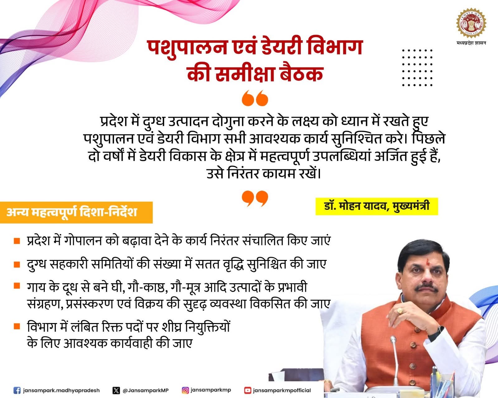 मुख्यमंत्री डॉ. मोहन यादव द्वारा पशुपालन एवं डेयरी विभाग की समीक्षा बैठक