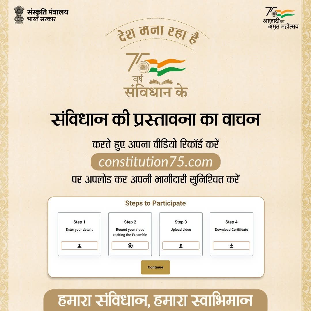 संविधान की प्रस्तावना का वाचन करते हुए अपना वीडियो रिकॉर्ड करें और constitution75.com पर अपलोड कर अपनी भागीदारी सुनिश्चित करें