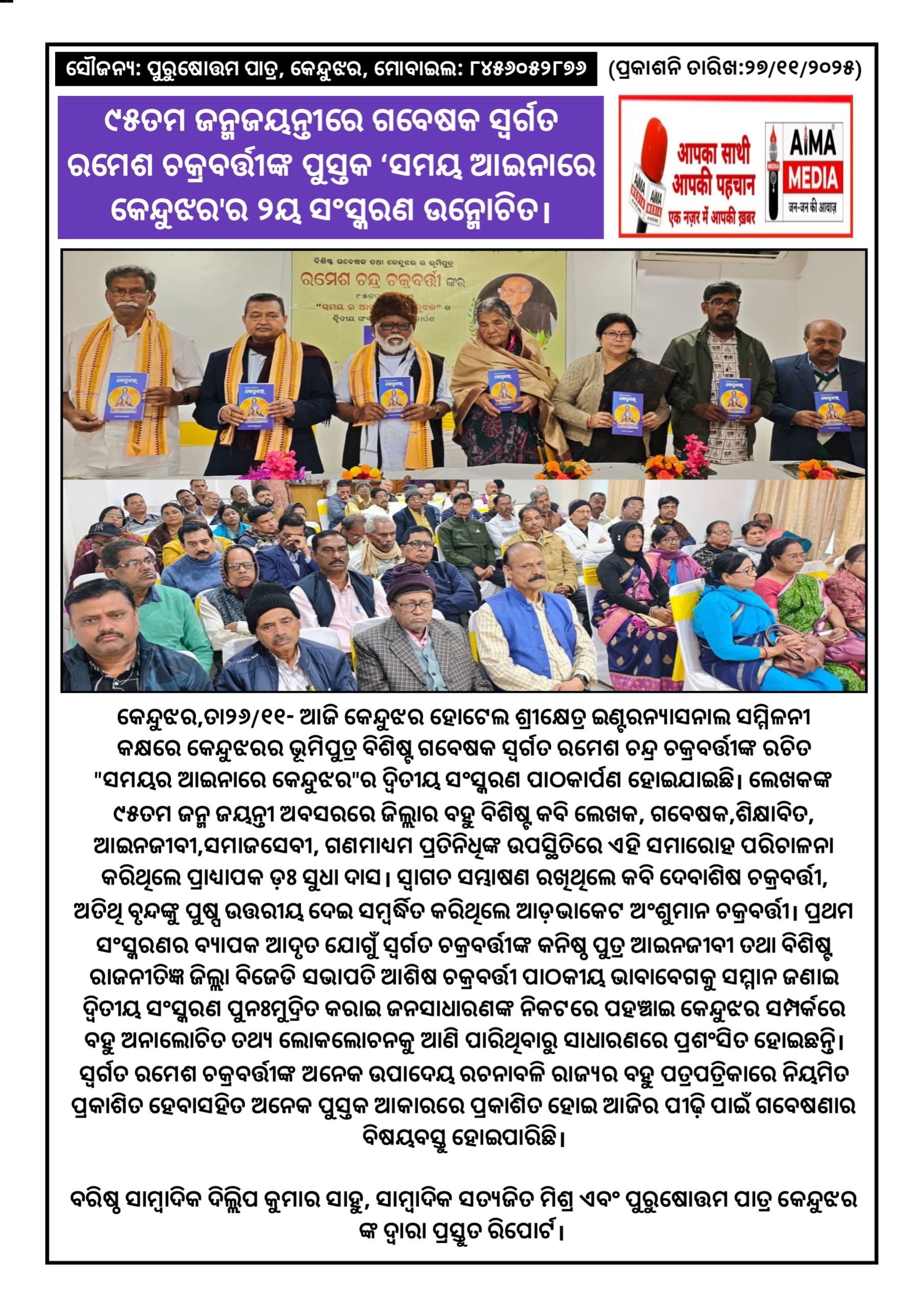୯୫ତମ ଜନ୍ମଜୟନ୍ତୀରେ ଗବେଷକ ସ୍ଵର୍ଗତ ରମେଶ ଚକ୍ରବର୍ତ୍ତୀଙ୍କ ପୁସ୍ତକ ‘ସମୟ ଆଇନାରେ କେନ୍ଦୁଝର'ର ୨ୟ ସଂସ୍କରଣ ଉନ୍ମୋଚିତ।