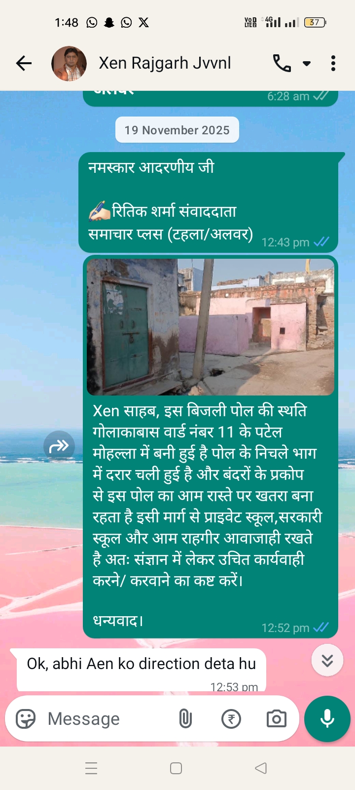 बिजली विभाग के जिम्मेदार उच्च अधिकारियों की घोर लापरवाहीसंवाददाता रितीक शर्मा गोलाकाबास: ग्रिड सब स्टेशन क्षेत्र के वार्ड नंबर 11 पटेल मोहल्ले में पंचायती मंदिर के समीप सड़क के किनारे बिजली का पोल कई दिनों से झुका हुआ है तो दूसरी ओर दरार चली हुई जिसकी सूचना मीडियाकर्मी ने एक सप्ताह पहले कॉल के माध्यम से राजगढ़ XEN को देने के बाद XEN ने टहला AEN को दिशा निर्देश देने की बात कहीं लेकिन जब मीडियाकर्मी ने AEN से क्षतिगस्त पोल की जानकारी जुटाने पर AEN ने बताया कि मेरे पास क्षतिगस्त पोल की कोई जानकारी या दिशा निर्देश प्राप्त नहीं हुए, जबकि XEN का मीडियाकर्मी से कहना था कि मैने टहला AEN को दिशा निर्देश दे दिए गए है जबकि AEN को पॉल से संबंधित कोई निर्देश प्राप्त नहीं हुए। बिजली विभाग के जिम्मेदार अधिकारियों की यह बड़ी लापरवाही और टालमटोल रवैया जो बिजली विभाग के अधिकारियों को हादसे का इंतजार है। पोल के पास आंगनबाड़ी पाठशाला खुला हुआ है जहां छोटे छोटे बच्चे पाठशाला पहुंचते है तो दूसरी ओर सड़क से स्कूल जाने वाले बच्चे व आम राहगीर आवागमन रखते है लेकिन बिजली विभाग के अधिकारी इस और कोई ध्यान नहीं देने से बड़ा हादसा हो सकता है।