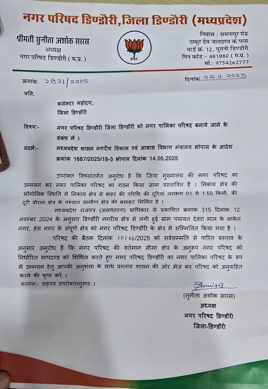 नगर परिषद ने शासन से अनुरोध किया है कि निर्धारित मापदंडों को ध्यान में रखते हुए डिंडौरी को नगर पालिका परिषद घोषित किया जाए, जिससे क्षेत्र के विकास कार्य और तेज़ी से हो सकें।