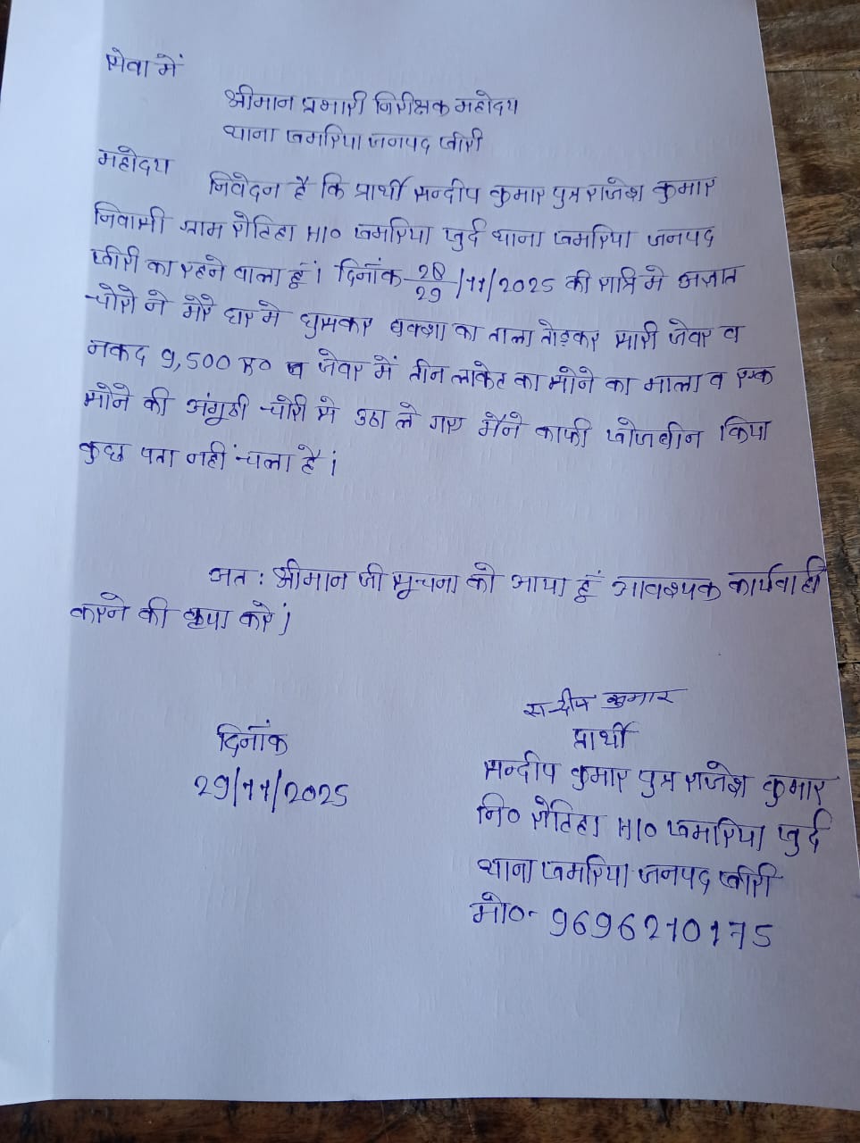ताज़ा मामला खमरिया क्षेत्र के ग्राम रोटिहा ग्राम पंचायत खमरिया खुर्द का सामने आया है, जहां के निवासी संदीप कुमार पुत्र राजेश कुमार के द्वारा दी गई तहरीर पर पता चला कि 28/11/2025 की रात अज्ञात चोरों ने घर में घुसकर धूमधड़क्का कर बक्से का ताला तोड़ दिया। चोर 9,500 रुपये नकद, जेवर में तीन लॉकेट का सोने का माला, व एक सोने की अंगूठी सहित कीमती बरतन चोर उठा ले गए। पीड़ित ने बताया कि चोरों की गतिविधि इतनी तेज थी कि शोर सुनते ही वे मौके से फरार हो गए। घटना के बाद पुलिस को सूचना तो दी गई, लेकिन अब तक कोई ठोस कार्रवाई नहीं हुई, जिससे ग्रामीणों में आक्रोश है।