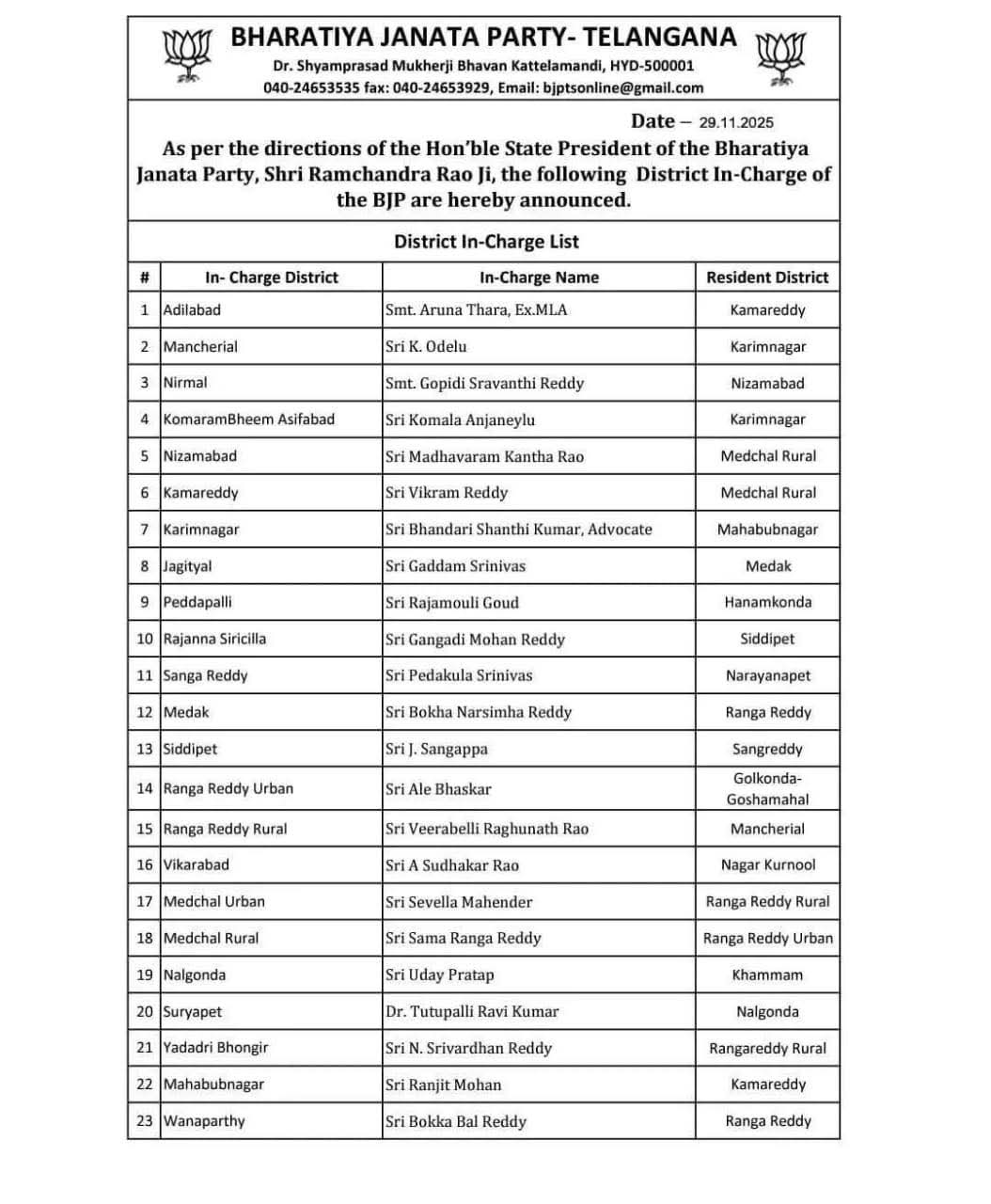 తెలంగాణ రాష్ట్ర బిజెపి నూతన జిల్లా అధ్యక్షులను నియమించడం జరిగింది.