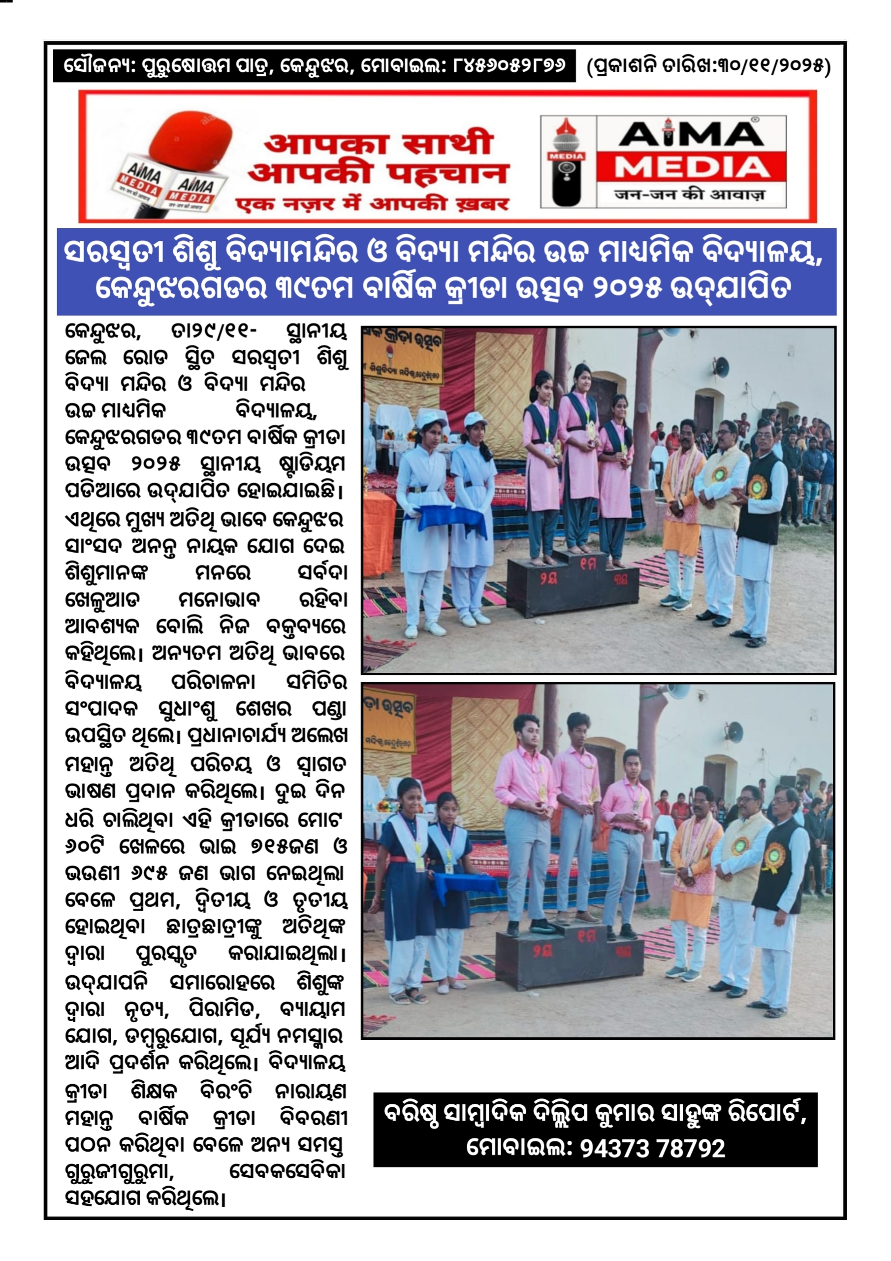 କେନ୍ଦୁଝର,ତା୨୯/୧୧- ସ୍ଥାନୀୟ ଜେଲରୋଡସ୍ଥିତ ସରସ୍ଵତୀ ଶିଶୁ ବିଦ୍ୟା ମନ୍ଦିର ଓ ବିଦ୍ୟା ମନ୍ଦିର ଉଚ୍ଚ ମାଧ୍ୟମିକ ବିଦ୍ୟାଳୟ, କେନ୍ଦୁଝରଗଡର ୩୯ତମ ବାର୍ଷିକ କ୍ରୀଡା ଉତ୍ସବ ୨୦୨୫ ସ୍ଥାନୀୟ ଷ୍ଟାଡିୟମ ପଡିଆରେ ଉଦ୍‌ଯାପିତ ହୋଇଯାଇଛି । ଏଥିରେ ମୁଖ୍ୟ ଅତିଥି ଭାବେ କେନ୍ଦୁଝର ସାଂସଦ ଅନନ୍ତ ନାୟକ ଯୋଗ ଦେଇ ଶିଶୁମାନଙ୍କ ମନରେ ସର୍ବଦା ଖେଳୁଆଡ ମନୋଭାବ ରହିବା ଆବଶ୍ୟକ ବୋଲି ନିଜ ବକ୍ତବ୍ୟରେ କହିଥିଲେ । ଅନ୍ୟତମ ଅତିଥି ଭାବରେ ବିଦ୍ୟାଳୟ ପରିଚାଳନା ସମିତିର ସଂପାଦକ ସୁଧାଂଶୁ ଶେଖର ପଣ୍ଡା ଉପସ୍ଥିତ ଥିଲେ। ପ୍ରଧାନାଚାର୍ଯ୍ୟ ଅଲେଖ ମହାନ୍ତ ଅତିଥି ପରିଚୟ ଓ ସ୍ୱାଗତ ଭାଷଣ ପ୍ରଦାନ କରିଥିଲେ । ଦୁଇ ଦିନ ଧରି ଚାଲିଥିବା ଏହି କ୍ରୀଡାରେ ମୋଟ ୬୦ଟି ଖେଳରେ ଭାଇ ୭୧୫ଜଣ ଓ ଭଉଣୀ ୬୯୫ ଜଣ ଭାଗ ନେଇଥିଲା ବେଳେ ପ୍ରଥମ, ଦ୍ଵିତୀୟ ଓ ତୃତୀୟ ହୋଇଥିବା ଛାତ୍ରଛାତ୍ରୀଙ୍କୁ ଅତିଥିଙ୍କ ଦ୍ୱାରା ପୁରସ୍କୃତ କରାଯାଇଥିଲା । ଉଦ୍‌ଯାପନି ସମାରୋହରେ ଶିଶୁଙ୍କ ଦ୍ବାରା ନୃତ୍ୟ, ପିରାମିଡ, ବ୍ୟାୟାମ ଯୋଗ, ଡମ୍ବରୁଯୋଗ, ସୂର୍ଯ୍ୟ ନମସ୍କାର ଆଦି ପ୍ରଦର୍ଶନ କରିଥିଲେ। ବିଦ୍ୟାଳୟ କ୍ରୀଡା ଶିକ୍ଷକ ବିରଂଚି ନାରାୟଣ ମହାନ୍ତ ବାର୍ଷିକ କ୍ରୀଡା ବିବରଣୀ ପଠନ କରିଥିବା ବେଳେ ଅନ୍ୟ ସମସ୍ତ ଗୁରୁଜୀଗୁରୁମା, ସେବକସେବିକା ସହଯୋଗ କରିଥିଲେ ।