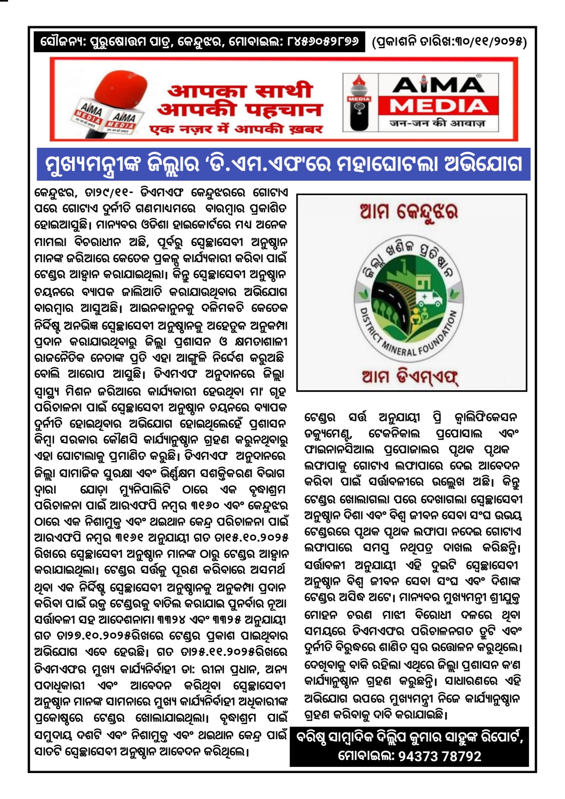 କେନ୍ଦୁଝର,ତା୨୯/୧୧- ଡିଏମଏଫ କେନ୍ଦୁଝରରେ ଗୋଟାଏ ପରେ ଗୋଟାଏ ଦୁର୍ନୀତି ଗଣମାଧ୍ୟମରେ ବାରମ୍ବାର ପ୍ରକାଶିତ ହୋଇଆସୁଛି। ମାନ୍ୟବର ଓଡିଶା ହାଇକୋର୍ଟରେ ମଧ୍ୟ ଅନେକ ମାମଲା ବିଚରାଧୀନ ଅଛି, ପୂର୍ବରୁ ସ୍ବେଚ୍ଛାସେବୀ ଅନୁଷ୍ଠାନ ମାନଙ୍କ ଜରିଆରେ କେତେକ ପ୍ରକଳ୍ପ କାର୍ଯ୍ୟକାରୀ କରିବା ପାଇଁ ଟେଣ୍ଡର ଆହ୍ୱାନ କରାଯାଇଥିଲା। କିନ୍ତୁ ସ୍ବେଚ୍ଛାସେବୀ ଅନୁଷ୍ଠାନ ଚୟନରେ ବ୍ୟାପକ ଜାଲିଆତି କରାଯାଉଥିବାର ଅଭିଯୋଗ ବାରମ୍ବାର ଆସୁଅଛି। ଆଇନକାନୁନକୁ ଦଳିମକଚି କେତେକ ନିର୍ଦ୍ଦିଷ୍ଟ ଅନଭିଜ୍ଞ ସ୍ବେଚ୍ଛାସେବୀ ଅନୁଷ୍ଠାନକୁ ଅହେତୁକ ଅନୁକମ୍ପା ପ୍ରଦାନ କରାଯାଉଥିବାରୁ ଜିଲ୍ଲା ପ୍ରଶାସନ ଓ କ୍ଷମତାଶାଳୀ ରାଜନୈତିକ ନେତାଙ୍କ ପ୍ରତି ଏହା ଆଙ୍ଗୁଳି ନିର୍ଦ୍ଦେଶ କରୁଅଛି ବୋଲି ଆରୋପ ଆସୁଛି । ଡିଏମଏଫ ଅନୁଦାନରେ ଜିଲ୍ଲା ସ୍ୱାସ୍ଥ୍ୟ ମିଶନ ଜରିଆରେ କାର୍ଯ୍ୟକାରୀ ହେଉଥିବା ମା' ଗୃହ ପରିଚାଳନା ପାଇଁ ସ୍ବେଚ୍ଛାସେବୀ ଅନୁଷ୍ଠାନ ଚୟନରେ ବ୍ୟାପକ ଦୁର୍ନୀତି ହୋଇଥିବାର ଅଭିଯୋଗ ହୋଇଥିଲେହେଁ ପ୍ରଶାସନ କିମ୍ବା ସରକାର କୌଣସି କାର୍ଯ୍ୟାନୁଷ୍ଠାନ ଗ୍ରହଣ କରୁନଥିବାରୁ ଏହା ଘୋଟାଲାକୁ ପ୍ରମାଣିତ କରୁଛି । ଡିଏମଏଫ ଅନୁଦାନରେ ଜିଲ୍ଲା ସାମାଜିକ ସୁରକ୍ଷା ଏବଂ ଭିର୍ଣ୍ଣକ୍ଷମ ସଶକ୍ତିକରଣ ବିଭାଗ ଦ୍ୱାରା ଯୋଡ଼ା ମ୍ୟୁନିପାଲିଟି ଠାରେ ଏକ ବୃଦ୍ଧାଶ୍ରମ ପରିଚାଳନା ପାଇଁ ଆରଏଫପି ନମ୍ବର ୩୧୬୦ ଏବଂ କେନ୍ଦୁଝର ଠାରେ ଏକ ନିଶାମୁକ୍ତ ଏବଂ ଥଇଥାନ କେନ୍ଦ୍ର ପରିଚାଳନା ପାଇଁ ଆରଏଫପି ନମ୍ବର ୩୧୬୧ ଅନୁଯାୟୀ ଗତ ତା୧୫.୧୦.୨୦୨୫ ରିଖରେ ସ୍ବେଚ୍ଛାସେବୀ ଅନୁଷ୍ଠାନ ମାନଙ୍କ ଠାରୁ ଟେଣ୍ଡର ଆହ୍ୱାନ କରାଯାଇଥିଲା। ଟେଣ୍ଡର ସର୍ତ୍ତକୁ ପୂରଣ କରିବାରେ ଅସମର୍ଥ ଥିବା ଏକ ନିର୍ଦ୍ଦିଷ୍ଟ ସ୍ବେଚ୍ଛାସେବୀ ଅନୁଷ୍ଠାନକୁ ଅନୁକମ୍ପା ପ୍ରଦାନ କରିବା ପାଇଁ ଉକ୍ତ ଟେଣ୍ଡରକୁ ବାତିଲ କରାଯାଇ ପୁନର୍ବାର ନୂଆ ସର୍ତ୍ତାବଳୀ ସହ ଆଦେଶନାମା ୩୩୨୪ ଏବଂ ୩୩୨୫ ଅନୁଯାୟୀ ଗତ ତା୨୭.୧୦.୨୦୨୫ରିଖରେ ଟେଣ୍ଡର ପ୍ରକାଶ ପାଇଥିବାର ଅଭିଯୋଗ ଏବେ ହେଉଛି। ଗତ ତା୨୫.୧୧.୨୦୨୫ରିଖରେ ଡିଏମଏଫର ମୁଖ୍ୟ କାର୍ଯ୍ୟନିର୍ବାହୀ ଡା: ରୀନା ପ୍ରଧାନ, ଅନ୍ୟ ପଦାଧିକାରୀ ଏବଂ ଆବେଦନ କରିଥିବା ସ୍ବେଚ୍ଛାସେବୀ ଅନୁଷ୍ଠାନ ମାନଙ୍କ ସାମନାରେ ମୁଖ୍ୟ କାର୍ଯ୍ୟନିର୍ବାହୀ ଅଧିକାରୀଙ୍କ ପ୍ରକୋଷ୍ଠରେ ଟେଣ୍ଡର ଖୋଲାଯାଇଥିଲା। ବୃଦ୍ଧାଶ୍ରମ ପାଇଁ ସମୁଦାୟ ଦଶଟି ଏବଂ ନିଶାମୁକ୍ତ ଏବଂ ଥଇଥାନ କେନ୍ଦ୍ର ପାଇଁ ସାତଟି ସ୍ବେଚ୍ଛାସେବୀ ଅନୁଷ୍ଠାନ ଆବେଦନ କରିଥିଲେ। ଟେଣ୍ଡର ସର୍ତ୍ତ ଅନୁଯାୟୀ ପ୍ରି କ୍ୱାଲିଫିକେସନ ଡକ୍ୟୁମେଣ୍ଟ, ଟେକନିକାଲ ପ୍ରପୋସାଲ ଏବଂ ଫାଇନାନସିଆଲ ପ୍ରପୋଜାଲର ପୃଥକ ପୃଥକ ଲଫାପାକୁ ଗୋଟାଏ ଲଫାପାରେ ଦେଇ ଆବେଦନ କରିବା ପାଇଁ ସର୍ତ୍ତାବଳୀରେ ଉଲ୍ଲେଖ ଅଛି। କିନ୍ତୁ ଟେଣ୍ଡର ଖୋଲାଗଲା ପରେ ଦେଖାଗଲା ସ୍ବେଚ୍ଛାସେବୀ ଅନୁଷ୍ଠାନ ଦିଶା ଏବଂ ବିଶ୍ୱ ଜୀବନ ସେବା ସଂଘ ଉଭୟ ଟେଣ୍ଡରରେ ପୃଥକ ପୃଥକ ଲଫାପା ନଦେଇ ଗୋଟାଏ ଲଫାପାରେ ସମସ୍ତ ନଥିପତ୍ର ଦାଖଲ କରିଛନ୍ତି।ସର୍ତ୍ତlବଳୀ ଅନୁଯାୟୀ ଏହି ଦୁଇଟି ସ୍ବେଚ୍ଛାସେବୀ ଅନୁଷ୍ଠାନ ବିଶ୍ୱ ଜୀବନ ସେବା ସଂଘ ଏବଂ ଦିଶାଙ୍କ ଟେଣ୍ଡର ଅସିଦ୍ଧ ଅଟେ। ମାନ୍ୟବର ମୁଖ୍ୟମନ୍ତୀ ଶ୍ରୀଯୁକ୍ତ ମୋହନ ଚରଣ ମାଝୀ ବିରୋଧୀ ଦଳରେ ଥିବା ସମୟରେ ଡିଏମଏଫର ପରିଚାଳନଗତ ତ୍