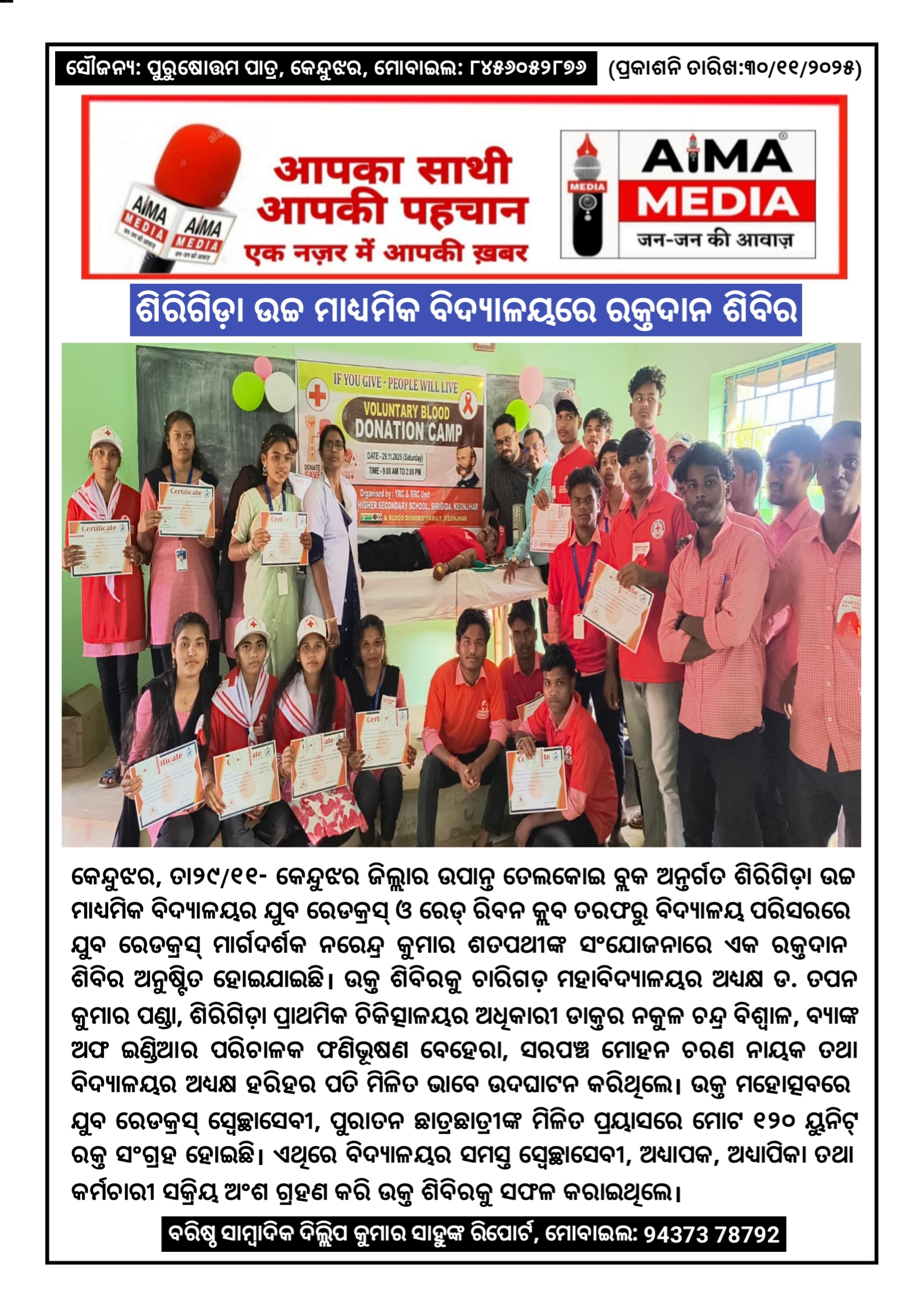 କେନ୍ଦୁଝର,ତା୨୯/୧୧- କେନ୍ଦୁଝର ଜିଲ୍ଲାର ଉପାନ୍ତ ତେଲକୋଇ ବ୍ଲକ ଅନ୍ତର୍ଗତ ଶିରିଗିଡ଼ା ଉଚ୍ଚ ମାଧ୍ୟମିକ ବିଦ୍ୟାଳୟର ଯୁବ ରେଡକ୍ରସ୍ ଓ ରେଡ୍‌ ରିବନ କ୍ଲବ ତରଫରୁ ବିଦ୍ୟାଳୟ ପରିସରରେ ଯୁବ ରେଡକ୍ରସ୍ ମାର୍ଗଦର୍ଶକ ନରେନ୍ଦ୍ର କୁମାର ଶତପଥୀଙ୍କ ସଂଯୋଜନାରେ ଏକ ରକ୍ତଦାନ ଶିବିର ଅନୁଷ୍ଟିତ ହୋଇଯାଇଛି।ଉକ୍ତ ଶିବିରକୁ ଚାରିଗଡ଼ ମହାବିଦ୍ୟାଳୟର ଅଧ୍ୟକ୍ଷ ଡ. ତପନ କୁମାର ପଣ୍ଡା,ଶିରିଗିଡ଼ା ପ୍ରାଥମିକ ଚିକିତ୍ସାଳୟର ଅଧିକାରୀ ଡାକ୍ତର ନକୁଳ ଚନ୍ଦ୍ର ବିଶ୍ବାଳ,ବ୍ୟାଙ୍କ ଅଫ ଇଣ୍ଡିଆର ପରିଚାଳକ ଫଣିଭୂଷଣ ବେହେରା,ସରପଞ୍ଚ ମୋହନ ଚରଣ ନାୟକ ତଥା ବିଦ୍ୟାଳୟର ଅଧ୍ୟକ୍ଷ ହରିହର ପତି ମିଳିତ ଭାବେ ଉଦଘାଟନ କରିଥିଲେ।ଉକ୍ତ ମହୋତ୍ସବରେ ଯୁବ ରେଡକ୍ରସ୍ ସ୍ଵେଚ୍ଛାସେବୀ,ପୁରାତନ ଛାତ୍ରଛାତ୍ରୀଙ୍କ ମିଳିତ ପ୍ରୟାସରେ ମୋଟ ୧୨୦ ୟୁନିଟ୍ ରକ୍ତ ସଂଗ୍ରହ ହୋଇଛି।ଏଥିରେ ବିଦ୍ୟାଳୟର ସମସ୍ତ ସ୍ଵେଚ୍ଛାସେବୀ, ଅଧ୍ୟାପକ, ଅଧ୍ୟାପିକା ତଥା କର୍ମଚାରୀ ସକ୍ରିୟ ଅଂଶ ଗ୍ରହଣ କରି ଉକ୍ତ ଶିବିରକୁ ସଫଳ କରାଇଥିଲେ।