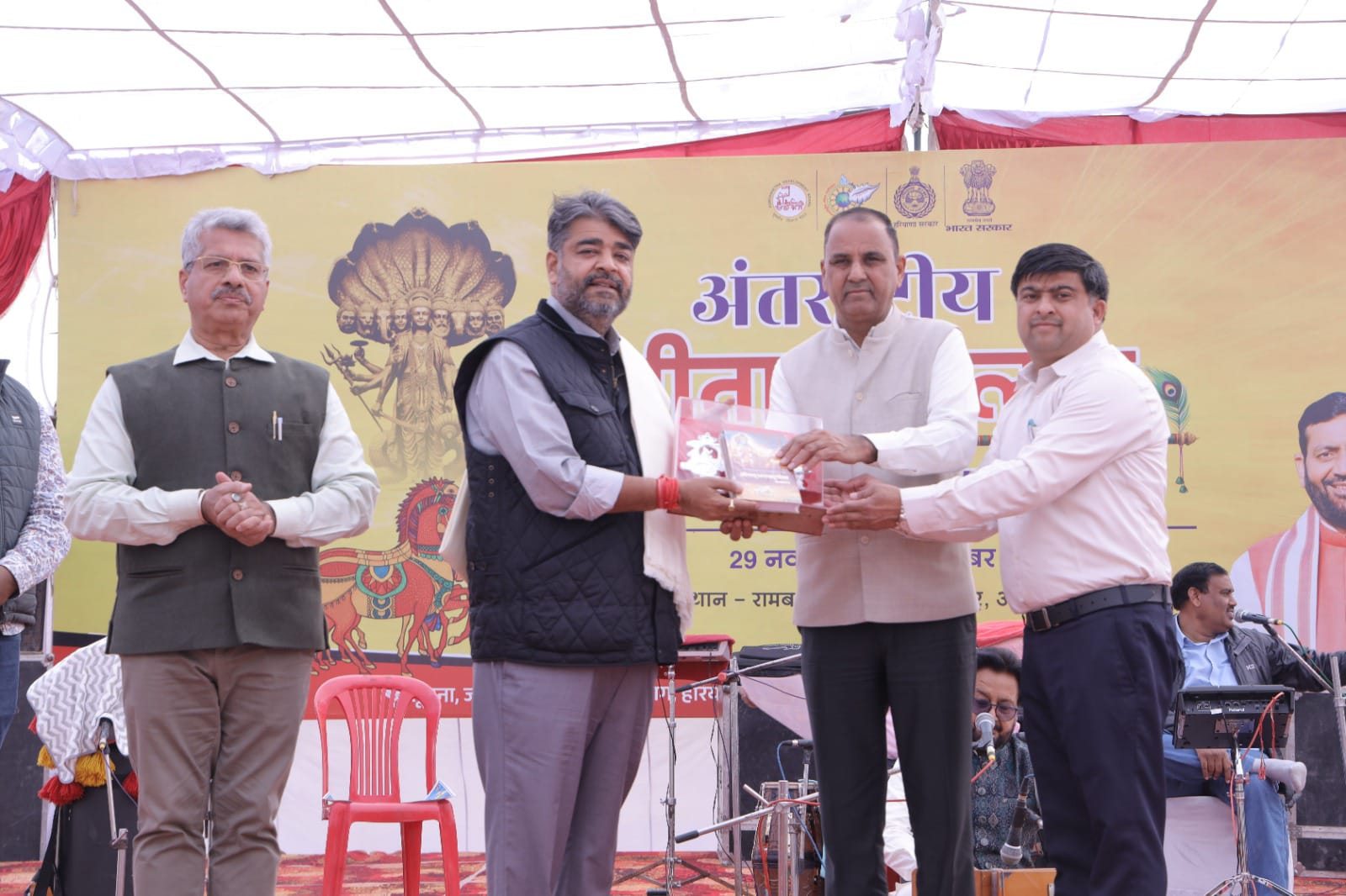 मुख्य अतिथि श्री असीम गोयल ने इस मौके पर जिला स्तरीय गीता जयती महोत्सव के सफलतापूर्वक आयोजन की सराहना करते हुए गीता महोत्सव की सभी को बधाई दी। उन्होंने इस अवसर पर कहा कि जीवन की सम्पूर्णता श्रीमदभगवदगीता में है, श्रीमदभगवदगीता का प्रत्येक श्लोक जीवन की सम्पूर्णता को प्रदर्शित करता है। उन्होंने कहा कि गीता जयंती महोत्सव जिला स्तर से लेकर प्रदेश स्तर तक मनाने का काम किया जा रहा है तथा विभिन्न सरकारों द्वारा भी कार्यक्रमों के माध्यम से गीता जयंती महोत्सव को मनाया जा रहा है। अंतर्राष्ट्रीय स्तर पर गीता जयंती महोत्सव का आयोजन कुरूक्षेत्र की पावन धरा पर होता है और अब श्रीमदभगवदगीता को विश्व पटल पर पहचान भी मिली है। भगवान श्री कृष्ण ने द्वापर युग में उपदेश दिए थे तथा बहुत सारे राजाओं, राष्ट्र अध्यक्षों के साथ-साथ विश्व के सुप्रसिद्ध हस्तियों ने भी श्रीमदभगवदगीता की ताकत, ऊर्जा को महसूस करते हुए अपने संस्करणों में श्रीमदभगवदगीता के बारे में लिखा है और बताया है। उन्होंने कहा कि श्रीमदभगवदगीता के 700 श्लोक हैं तथा 18 अध्याय है, यदि मानव श्रीमदभगवदगीता के एक भी श्लोक को अपने जीवन में आत्मसात कर ले तो वह अपना जीवन पवित्र एवं खुशहाल बना सकता है । श्रीमदभगवदगीता हमें समाज की सम्पत्ति बनाने की ओर अग्रसर करती है, श्रीमदभगवदगीता समाज की सम्पत्ति है और हमें श्रीमदभगवदगीता से जुडक़र गीता का संदेश जन-जन तक पहुंचाना है।