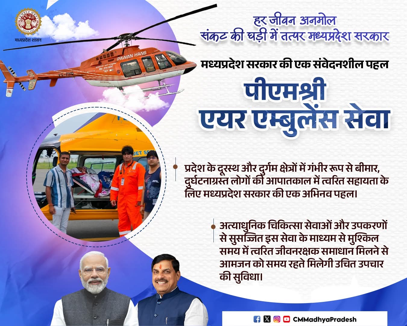 स्वस्थ और सुरक्षित मध्यप्रदेश का संकल्पमध्यप्रदेश सरकार की एक संवेदनशील पहल "पीएमश्री एयर एम्बुलेंस सेवा" Dr Mohan Yadav #CMMadhyaPradesh