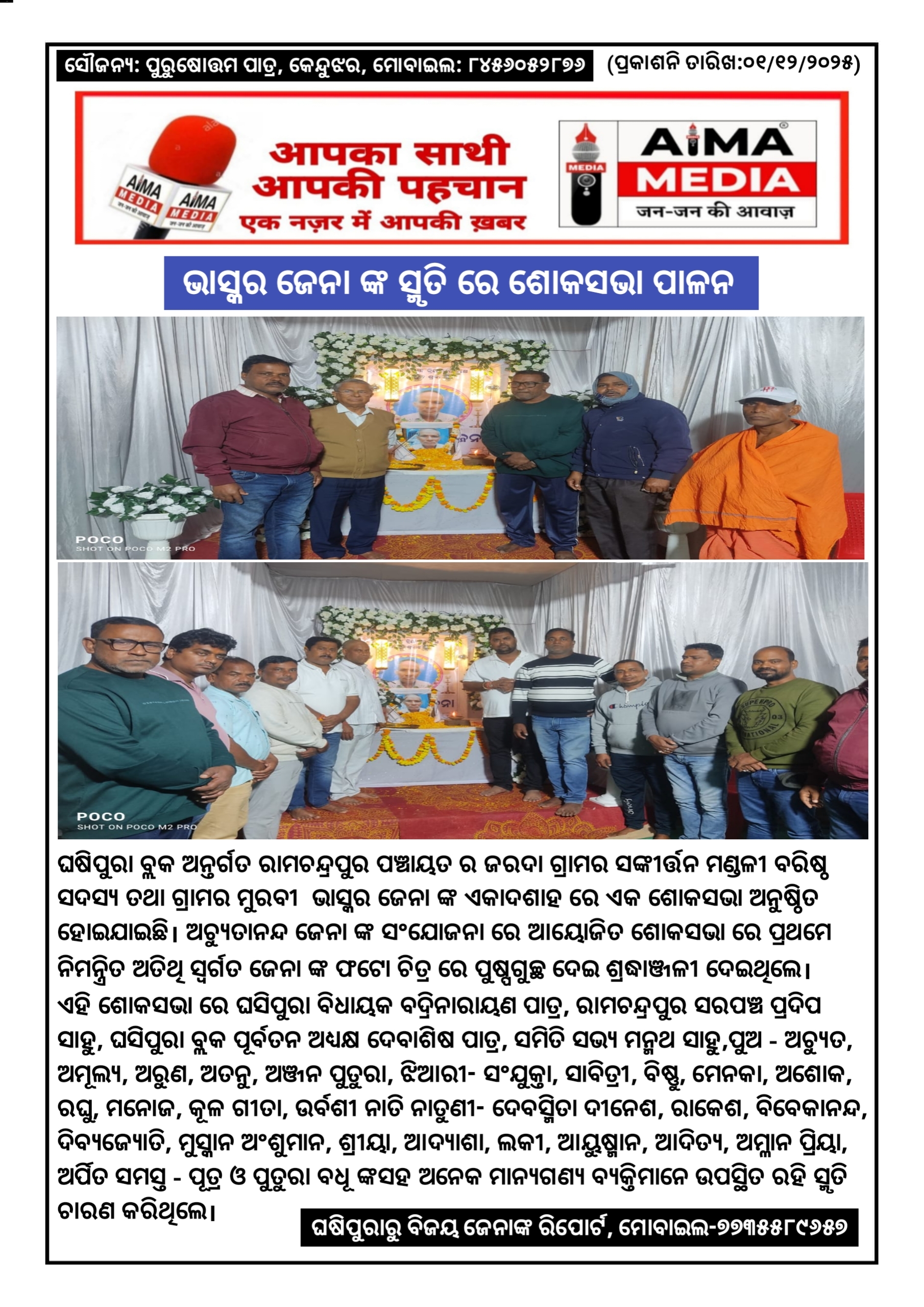 ଘଷିପୁରା ବ୍ଲକ ଅନ୍ତର୍ଗତ ରାମଚନ୍ଦ୍ରପୁର ପଞ୍ଚାୟତ ର ଜରଦା ଗ୍ରାମର ସଙ୍କୀର୍ତ୍ତନ ମଣ୍ଡଳୀ ବରିଷ୍ଠ ସଦସ୍ୟ ତଥା ଗ୍ରାମର ମୁରବୀ ଭାସ୍କର ଜେନା ଙ୍କ ଏକାଦଶାହ ରେ ଏକ ଶୋକସଭା ଅନୁଷ୍ଠିତ ହୋଇଯାଇଛି। ଅଚ୍ୟୁତାନନ୍ଦ ଜେନା ଙ୍କ ସଂଯୋଜନା ରେ ଆୟୋଜିତ ଶୋକସଭା ରେ ପ୍ରଥମେ ନିମନ୍ତ୍ରିତ ଅତିଥି ସ୍ୱର୍ଗତ ଜେନା ଙ୍କ ଫଟୋ ଚିତ୍ର ରେ ପୁଷ୍ପଗୁଚ୍ଛ ଦେଇ ଶ୍ରଦ୍ଧାଞ୍ଜଳୀ ଦେଇଥିଲେ। ଏହି ଶୋକସଭା ରେ ଘସିପୁରା ବିଧାୟକ ବଦ୍ରିନାରାୟଣ ପାତ୍ର, ରାମଚନ୍ଦ୍ରପୁର ସରପଞ୍ଚ ପ୍ରଦିପ ସାହୁ,ଘସିପୁରା ବ୍ଲକ ପୂର୍ବତନ ଅଧ୍ୟକ୍ଷ ଦେବାଶିଷ ପାତ୍ର, ସମିତି ସଭ୍ୟ ମନ୍ମଥ ସାହୁ,ପୁଅ - ଅଚ୍ୟୁତ, ଅମୂଲ୍ୟ, ଅରୁଣ, ଅତନୁ, ଅଞ୍ଜନ