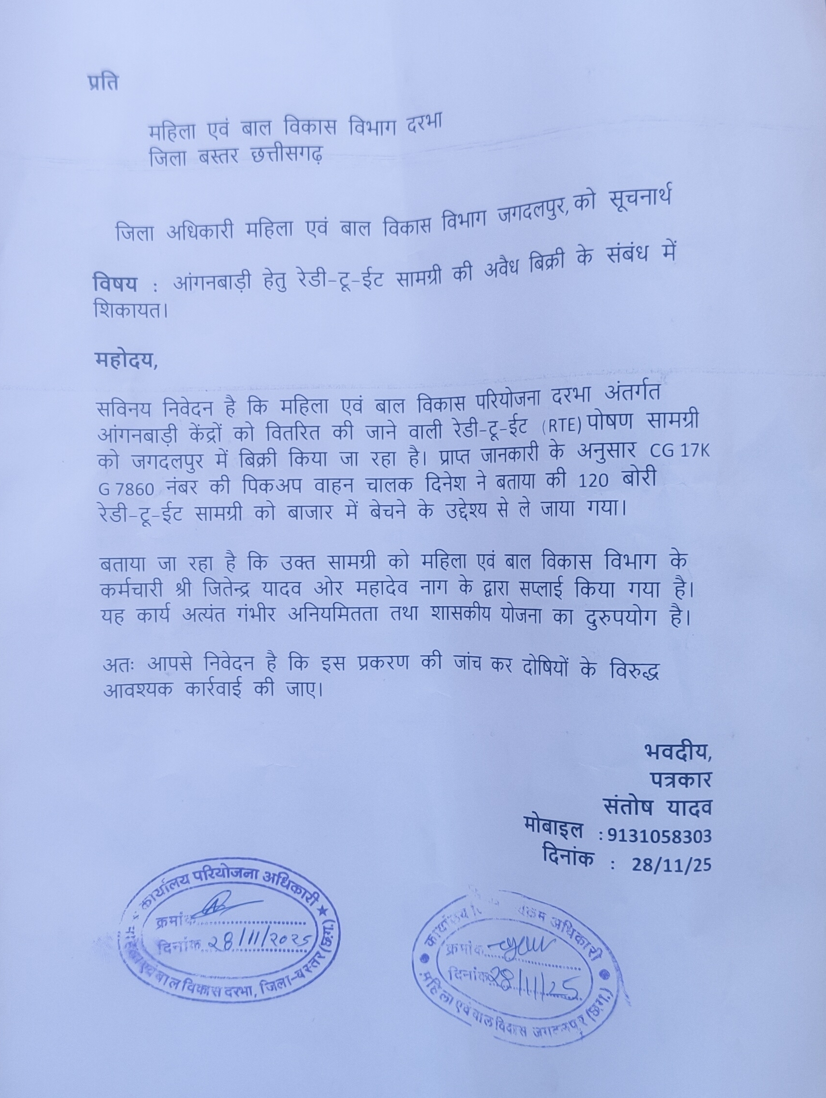 महिला एवं बाल विकास विभाग दरभा के कर्मचारी द्वारा आंगनबाड़ी हेतु रेडी-टू-ईट (RTE) सामग्री की अवैध बिक्री