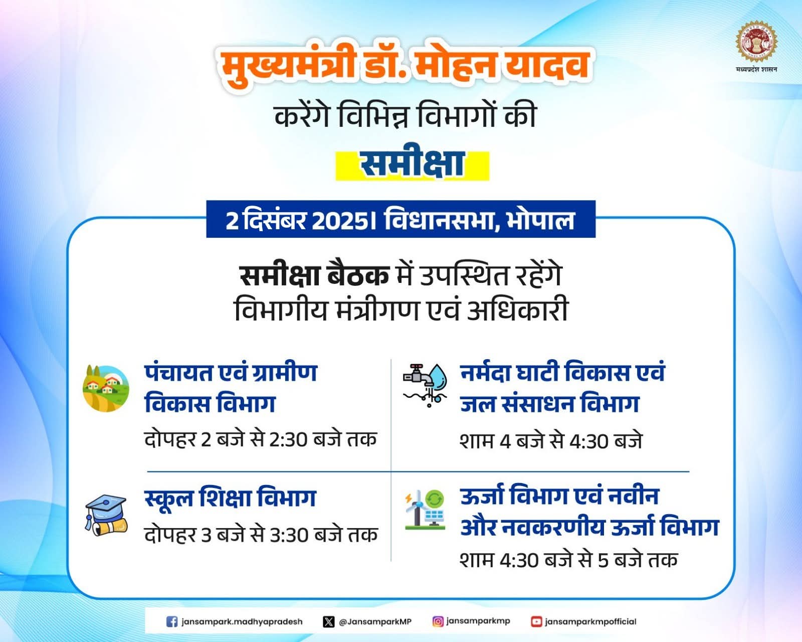 मुख्यमंत्री डॉ. मोहन यादव, 2 दिसंबर को करेंगे विभिन्न विभागों की समीक्षा