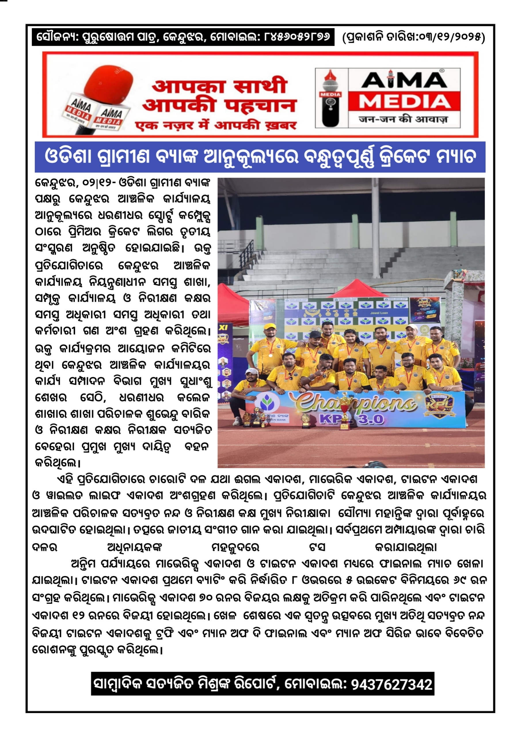 କେନ୍ଦୁଝର, ୦୨|୧୨ ଓଡିଶା ଗ୍ରାମୀଣ ବ୍ୟାଙ୍କ ପକ୍ଷରୁ କେନ୍ଦୁଝର ଆଞ୍ଚଳିକ କାର୍ଯ୍ୟାଳୟ ଆନୁକୂଲ୍ୟରେ ଧରଣୀଧର ସ୍ପୋର୍ଟ୍ସ କମ୍ପ୍ଲେକ୍ସ ଠାରେ ପ୍ରିମିଅର କ୍ରିକେଟ ଲିଗର ତୃତୀୟ ସଂସ୍କରଣ ଅନୁଷ୍ଠିତ ହୋଇଯାଇଛି l ଉକ୍ତ ପ୍ରତିଯୋଗିତାରେ କେନ୍ଦୁଝର ଆଞ୍ଚଳିକ କାର୍ଯ୍ୟାଳୟ ନିୟନ୍ତ୍ରଣlଧୀନ ସମସ୍ତ ଶାଖା, ସମ୍ପୃକ୍ତ କାର୍ଯ୍ୟାଳୟ ଓ ନିରୀକ୍ଷଣ କକ୍ଷର ସମସ୍ତ ଅଧିକାରୀ ସମସ୍ତ ଅଧିକାରୀ ତଥା କର୍ମଚାରୀ ଗଣ ଅଂଶ ଗ୍ରହଣ କରିଥିଲେ l ଉକ୍ତ କାର୍ଯ୍ୟକ୍ରମର ଆୟୋଜନ କମିଟିରେ ଥିବା କେନ୍ଦୁଝର ଆଞ୍ଚଳିକ କାର୍ଯ୍ୟାଳୟର କାର୍ଯ୍ୟ ସମ୍ପାଦନ ବିଭାଗ ମୁଖ୍ୟ ସୁଧାଂଶୁ ଶେଖର ସେଠି, ଧରଣୀଧର କଲେଜ ଶାଖାର ଶାଖା ପରିଚାଳକ ଶୁଭେନ୍ଦୁ ବାରିକ ଓ ନିରୀକ୍ଷଣ କକ୍ଷର ନିରୀକ୍ଷକ ସତ୍ୟଜିତ ବେହେରା ପ୍ରମୁଖ ମୁଖ୍ୟ ଦାୟିତ୍ୱ ବହନ କରିଥିଲେ l