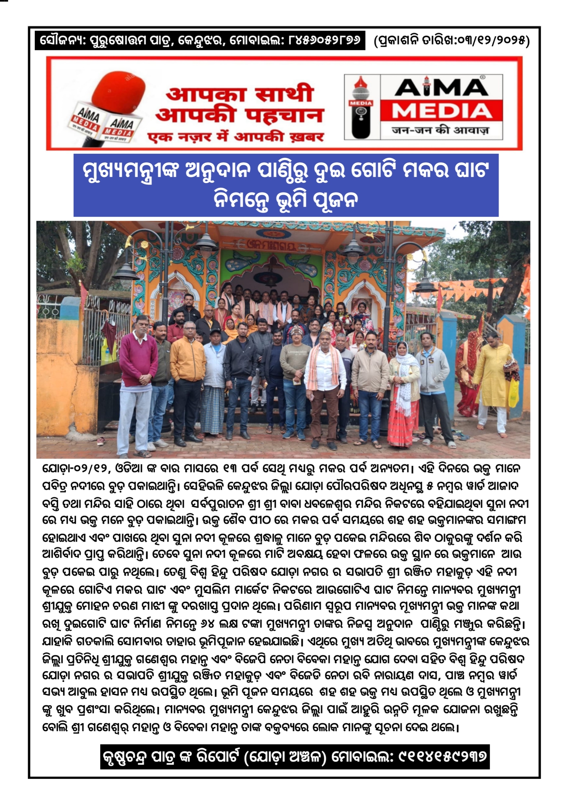 ମୁଖ୍ୟମନ୍ତ୍ରୀ ଙ୍କ ଅନୁଦାନ ପାଣ୍ଠିରୁ ଦୁଇ ଗୋଟି ମକର ଘାଟ ନିମନ୍ତେ ଭୂମି ପୂଜନ।