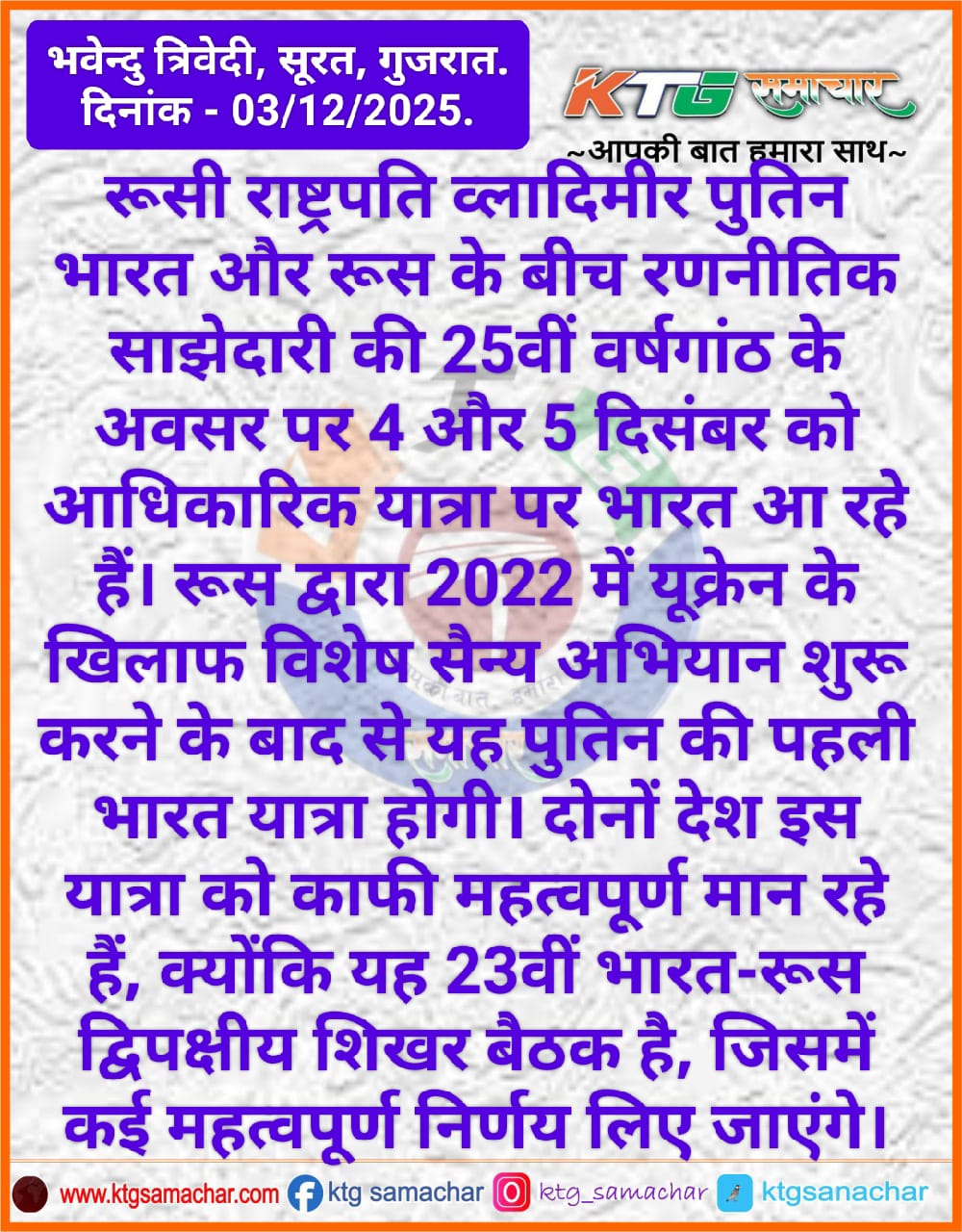 रूसी राष्ट्रपति कल से दो दिवसीय भारत के दौरे पर।
