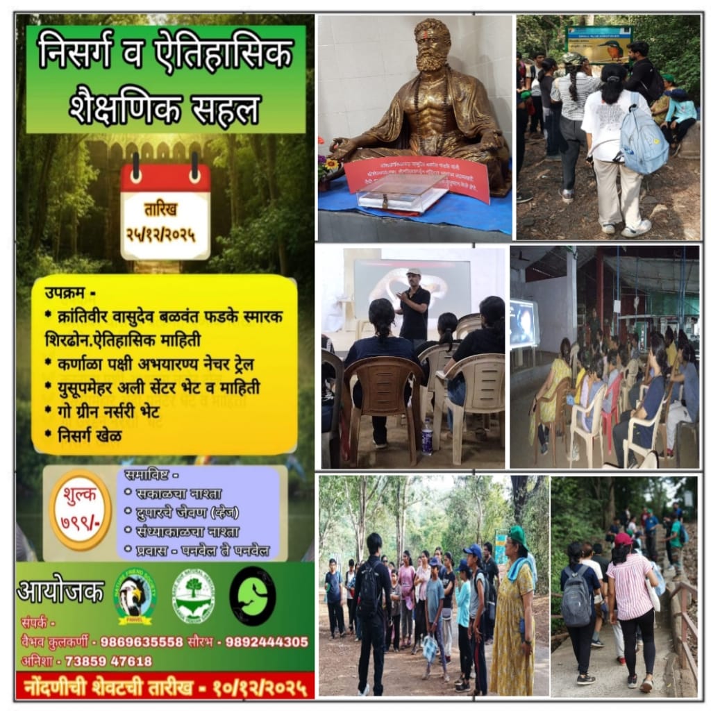 निसर्गप्रेम, इतिहासभान आणि पर्यावरणजाणिव यांचा संगम साधणारी “निसर्ग व ऐतिहासिक शैक्षणिक सहल” गुरवार , दि . २५ डिसेंबर २०२५ रोजी पनवेल परिसरात आयोजित करण्यात आली आहे. ही सहल विद्यार्थ्यांसह सर्व वयोगटातील निसर्गप्रेमींना अभ्यासपूर्ण व अनुभवसमृद्ध ठरणार आहे.