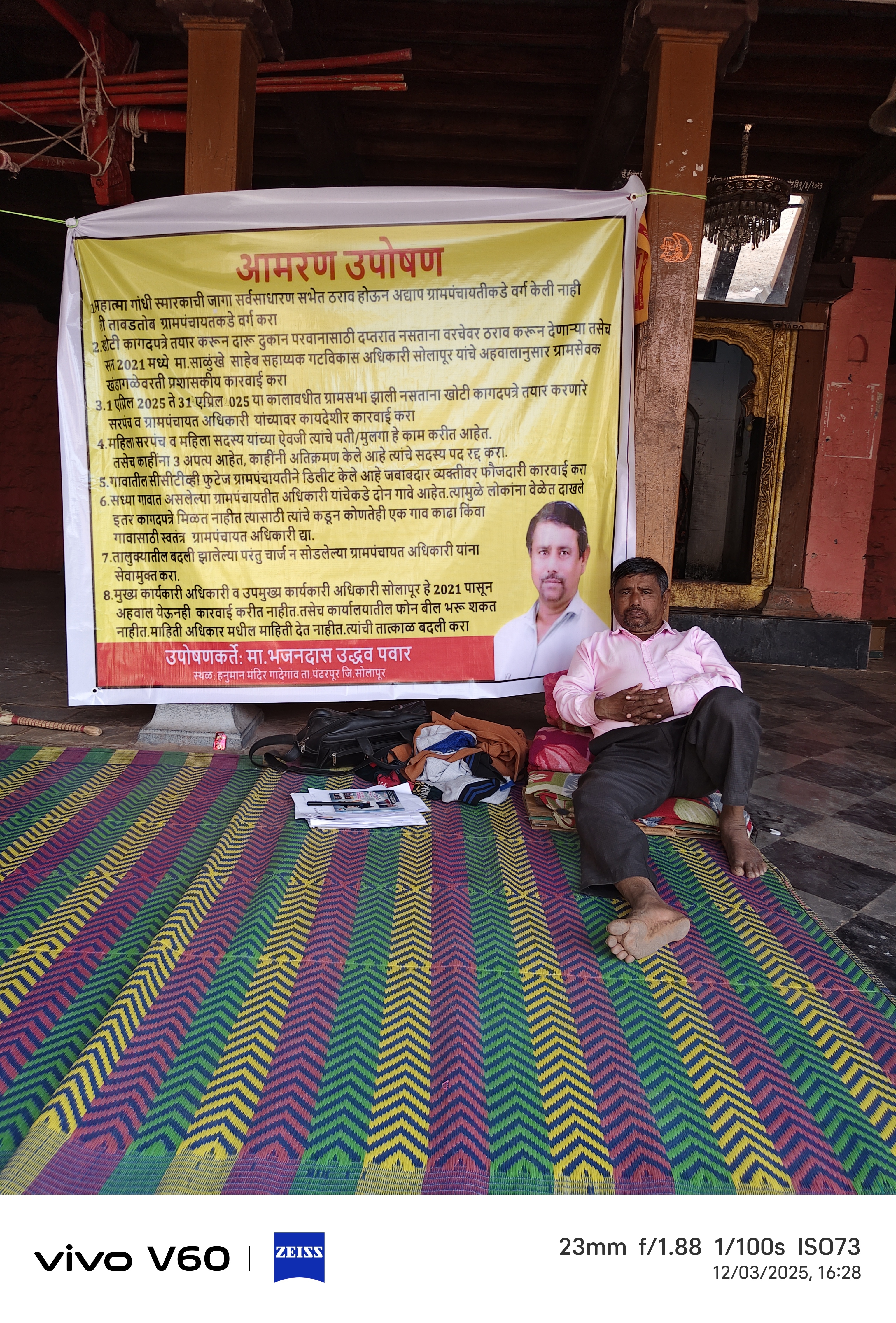 महात्मा गांधी स्मारकाची जागा सर्वसाधारण सभेत ठराव होऊन अद्याप ग्रामपंचायतीकडे वर्ग केली नाही ती ताबडतोब वर्ग करा खोटी कागदपत्रे तयार करून दारू दुकान परवासाठी दत्तराज नसताना वरचेवर ठराव करून देणाऱ्या तसेच 2021 मध्ये माननीय साळुंखे साहेब सहाय्यक कठीण शेतकरी सोलापूर यांचे अहवालानुसार ग्रामसेवक खंडागळे वरती प्रशासकी कारवाई करा एक एप्रिल 2025 ते 31 मे 2025 या कालावधीत ग्रामसभा झाली नसताना खोटी कागदपत्रे तयार करणारे सरपंच व ग्रामपंचायत अधिकारी यांच्यावर कायदेशीर कारवाई करा महिला सरपंच व महिला सदस्य यांच्या ऐवजी त्यांचे पती मुलगा एक काम करीत आहेत तसेच काही नक्की आहेत काहींनी अतिक्रिमेंट केली आहे त्यांची सदस्य पद रद्द करा गावातील सीसीटीव्ही फुटेज ग्रामपंचायतीने डिलीट केले आहे जबाबदार व्यक्तीवर फौजदारी कारवाई करा सध्या गावात असलेल्या ग्रामपंचायत अधिकाऱ्याकडे दोन गावे त्यामुळे लोकांना वेळेवर दाखले व इतर कागदपत्रे मिळत नाहीत त्यासाठी त्यांच्याकडून कोणतीही एक गाव काढा किंवा गावासाठी स्वतंत्र ग्रामपंचायत तालुक्यातील बदली झालेल्या परंतु चार्जिंग सोडलेल्या ग्रामपंचायत यांना सेवा मुक्त करा मुख्य कार्यकारी अधिकारी व उपमुख्य कार्यकारी अधिकारी हे 2021 पासून अहवाल येऊनी कारवाई करीत नाहीत तसेच कार्यालयातील फोन बिल भरू शकत नाहीत माहिती अधिकार मधील माहिती देत नाहीत त्यांची तात्काळ बदली करा या मागण्यासाठी दिनांक 1 डिसेंबर 2025 पासून भोजनदास पवार हे येथील हनुमान मंदिर येथे आमरण उपोषणास बसलेले आहे व उपोषणाचा आजचा तिसरा दिवस आहे