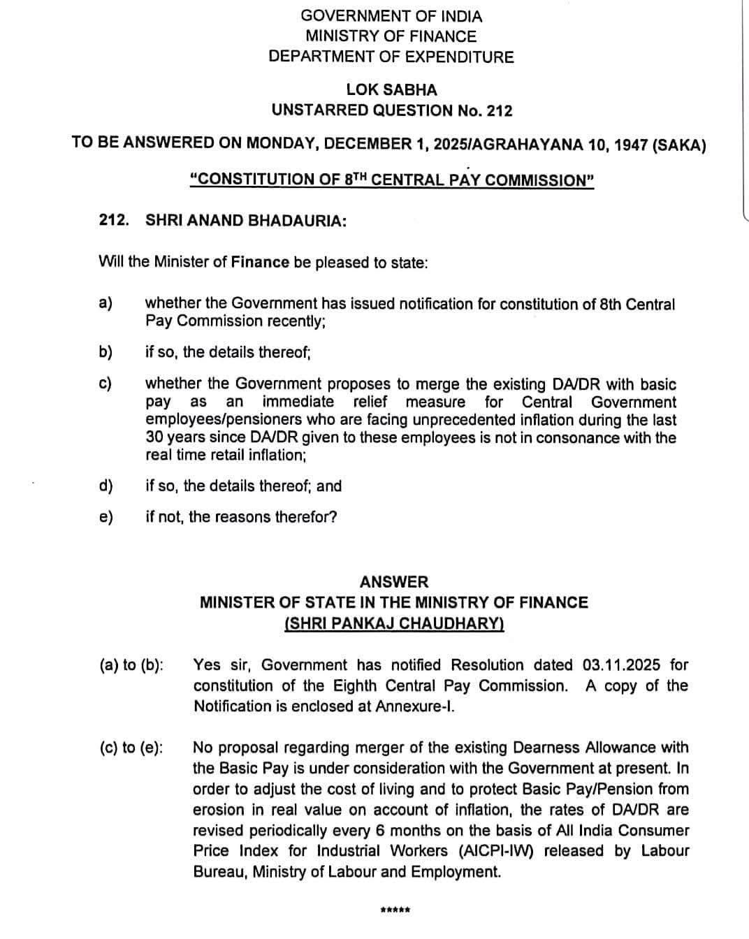 рд╕рдВрд╕рдж (рд▓реЛрдХрд╕рднрд╛) рдореЗрдВ рдкреВрдЫреЗ рдЧрдП рдкреНрд░рд╢реНрди рдХреЗ рдЙрддреНрддрд░ рдореЗрдВ, рд░рд╛рдЬреНрдп рдордВрддреНрд░реА (рд╡рд┐рддреНрдд) Pankaj Chaudhary рдиреЗ рд╕реНрдкрд╖реНрдЯ рдХрд┐рдпрд╛ рдХрд┐ тАЬрд╡рд░реНрддрдорд╛рди рдореЗрдВ рдХрд┐рд╕реА рднреА рдкреНрд░рдХрд╛рд░ рдХрд╛ DA/DR-рдмреЗрд╕рд┐рдХ рдкреЗ рдорд░реНрдЬ рдХрд╛ рдкреНрд░рд╕реНрддрд╛рд╡ рд╕рд░рдХрд╛рд░ рдХреЗ рд╕рдордХреНрд╖ рдирд╣реАрдВ рд╣реИ.тАЭ