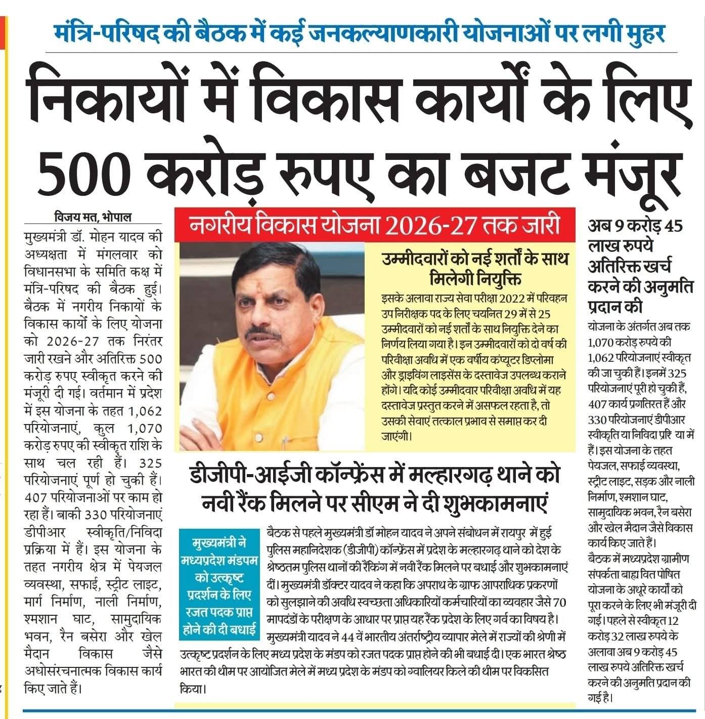 🔹निकायों में विकास कार्यों के लिए ₹500 करोड़ का बजट मंजूर