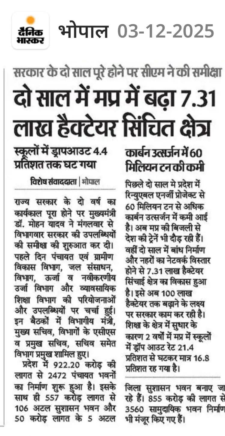 दो साल में मध्यप्रदेश में बढ़ा 7.31 लाख हेक्टेयर सिंचित क्षेत्र