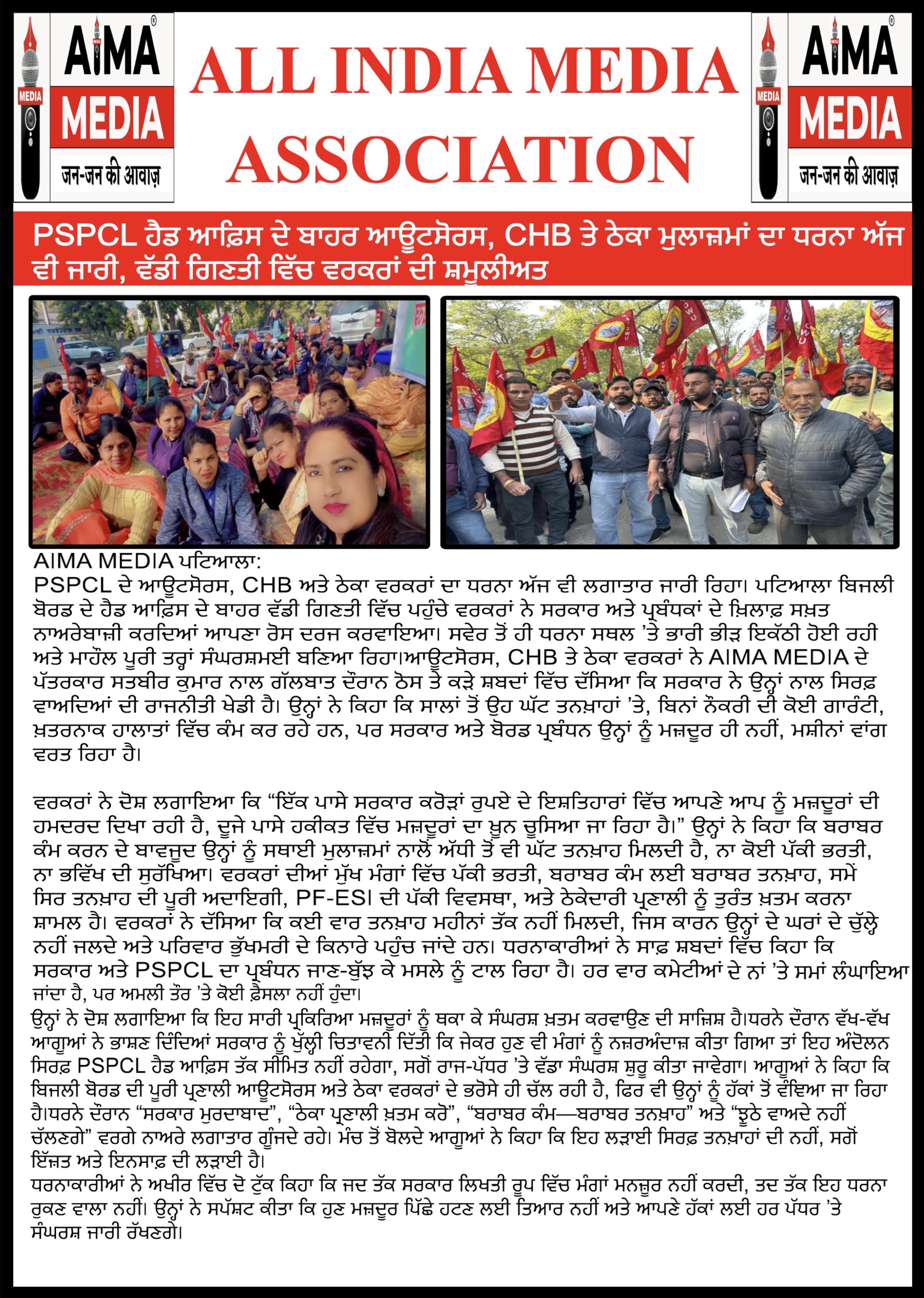 ਪਟਿਆਲਾ | AIMA MEDIA NEWS — PSPCL ਹੈਡ ਆਫਿਸ ਦੇ ਬਾਹਰ ਆਊਟਸੋਰਸ/ਸੀਐੱਚਬੀ ਮੁਲਾਜ਼ਮਾਂ ਦਾ ਧਰਨਾ ਅੱਜ ਵੀ ਰਿਹਾ ਜਾਰੀ ।