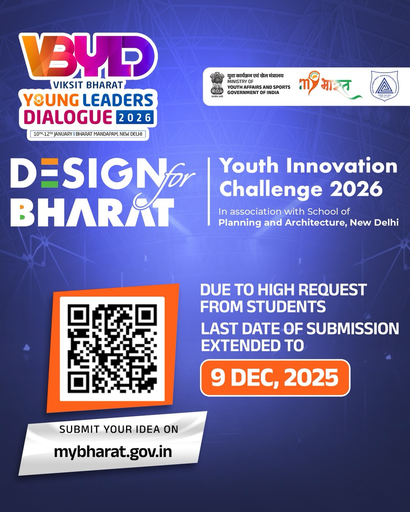 भारत सरकार के युवा कार्य एवं खेल मंत्रालय ने MY Bharat प्लेटफ़ॉर्म के माध्यम से Design for Bharat 2026 नामक राष्ट्रीय डिज़ाइन व इनोवेशन चैलेंज की घोषणा की है। यह कार्यक्रम Viksit Bharat Young Leaders Dialogue 2026 का हिस्सा है, जिसका उद्देश्य युवाओं में क्रिएटिविटी, समस्या-समाधान और नवाचार क्षमता को बढ़ावा देना है।