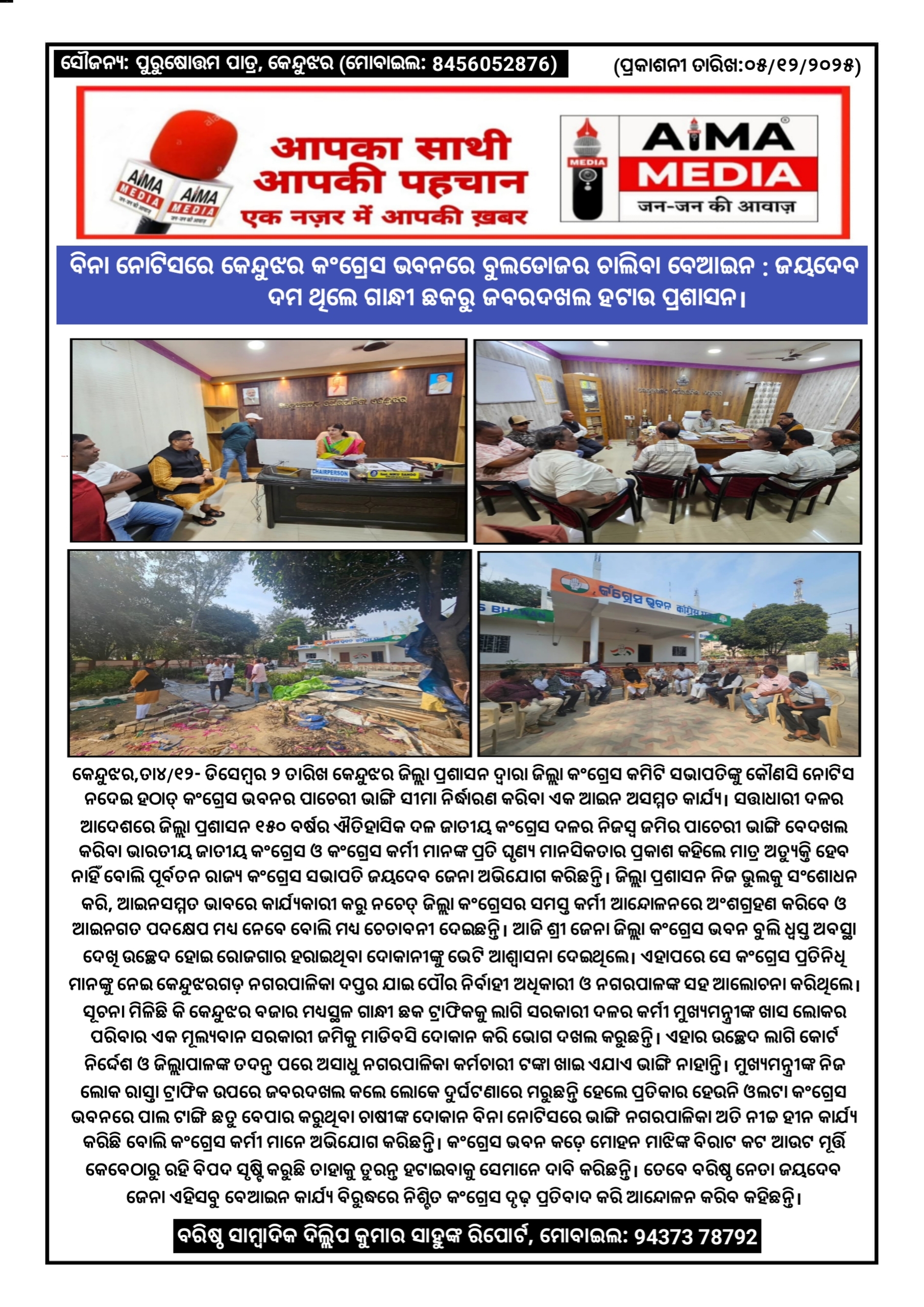 କେନ୍ଦୁଝର,ତା୪/୧୨- ଡିସେମ୍ବର ୨ ତାରିଖ କେନ୍ଦୁଝର ଜିଲ୍ଲା ପ୍ରଶାସନ ଦ୍ୱାରା ଜିଲ୍ଲା କଂଗ୍ରେସ କମିଟି ସଭାପତିଙ୍କୁ କୌଣସି ନୋଟିସ ନଦେଇ ହଠାତ୍ କଂଗ୍ରେସ ଭବନର ପାଚେରୀ ଭାଙ୍ଗି ସୀମା ନିର୍ଦ୍ଧାରଣ କରିବା ଏକ ଆଇନ ଅସମ୍ମତ କାର୍ଯ୍ୟ। ସତ୍ତାଧାରୀ ଦଳର ଆଦେଶରେ ଜିଲ୍ଲା ପ୍ରଶାସନ ୧୫୦ ବର୍ଷର ଐତିହାସିକ ଦଳ ଜାତୀୟ କଂଗ୍ରେସ ଦଳର ନିଜସ୍ୱ ଜମିର ପାଚେରୀ ଭାଙ୍ଗି ବେଦଖଲ କରିବା ଭାରତୀୟ ଜାତୀୟ କଂଗ୍ରେସ ଓ କଂଗ୍ରେସ କର୍ମୀ ମାନଙ୍କ ପ୍ରତି ଘୃଣ୍ୟ ମାନସିକତାର ପ୍ରକାଶ କହିଲେ ମାତ୍ର ଅତ୍ୟୁକ୍ତି ହେବ ନାହିଁ ବୋଲି ପୂର୍ବତନ ରାଜ୍ୟ କଂଗ୍ରେସ ସଭାପତି ଜୟଦେବ ଜେନା ଅଭିଯୋଗ କରିଛନ୍ତି। ଜିଲ୍ଲା ପ୍ରଶାସନ ନିଜ ଭୁଲକୁ ସଂଶୋଧନ କରି, ଆଇନସମ୍ମତ ଭାବରେ କାର୍ଯ୍ୟକାରୀ କରୁ ନଚେତ୍ ଜିଲ୍ଲା କଂଗ୍ରେସର ସମସ୍ତ କର୍ମୀ ଆନ୍ଦୋଳନରେ ଅଂଶଗ୍ରହଣ କରିବେ ଓ ଆଇନଗତ ପଦକ୍ଷେପ ମଧ୍ୟ ନେବେ ବୋଲି ମଧ୍ୟ ଚେତାବନୀ ଦେଇଛନ୍ତି। ଆଜି ଶ୍ରୀ ଜେନା ଜିଲ୍ଲା କଂଗ୍ରେସ ଭବନ ବୁଲି ଧ୍ୱସ୍ତ ଅବସ୍ଥା ଦେଖି ଉଚ୍ଛେଦ ହୋଇ ରୋଜଗାର ହରାଇଥିବା ଦୋକାନୀଙ୍କୁ ଭେଟି ଆଶ୍ୱାସନା ଦେଇଥିଲେ। ଏହାପରେ ସେ କଂଗ୍ରେସ ପ୍ରତିନିଧି ମାନଙ୍କୁ ନେଇ କେନ୍ଦୁଝରଗଡ଼ ନଗରପାଳିକା ଦପ୍ତର ଯାଇ ପୌର ନିର୍ବାହୀ ଅଧିକାରୀ ଓ ନଗରପାଳଙ୍କ ସହ ଆଲୋଚନା କରିଥିଲେ। ସୂଚନା ମିଳିଛି କି କେନ୍ଦୁଝର ବଜାର ମଧ୍ୟସ୍ଥଳ ଗାନ୍ଧୀ ଛକ ଟ୍ରାଫିକକୁ ଲାଗି ସରକାରୀ ଦଳର କର୍ମୀ ମୁଖ୍ୟମନ୍ତ୍ରୀଙ୍କ ଖାସ ଲୋକର ପରିବାର ଏକ ମୂଲ୍ୟବାନ ସରକାରୀ ଜମିକୁ ମାଡିବସି ଦୋକାନ କରି ଭୋଗ ଦଖଲ କରୁଛନ୍ତି। ଏହାର ଉଚ୍ଛେଦ ଲାଗି କୋର୍ଟ ନିର୍ଦ୍ଦେଶ ଓ ଜିଲ୍ଲାପାଳଙ୍କ ତଦନ୍ତ ପରେ ଅସାଧୁ ନଗରପାଳିକା କର୍ମଚାରୀ ଟଙ୍କା ଖାଇ ଏଯାଏ ଭାଙ୍ଗି ନାହାନ୍ତି। ମୁଖ୍ୟମନ୍ତ୍ରୀଙ୍କ ନିଜ ଲୋକ ରାସ୍ତା ଟ୍ରାଫିକ ଉପରେ ଜବରଦଖଲ କଲେ ଲୋକେ ଦୁର୍ଘଟଣାରେ ମରୁଛନ୍ତି ହେଲେ ପ୍ରତିକାର ହେଉନି ଓଲଟା କଂଗ୍ରେସ ଭବନରେ ପାଲ ଟାଙ୍ଗି ଛତୁ ବେପାର କରୁଥିବା ଚାଷୀଙ୍କ ଦୋକାନ ବିନା ନୋଟିସରେ ଭାଙ୍ଗି ନଗରପାଳିକା ଅତି ନୀଚ୍ଚ ହୀନ କାର୍ଯ୍ୟ କରିଛି ବୋଲି କଂଗ୍ରେସ କର୍ମୀ ମାନେ ଅଭିଯୋଗ କରିଛନ୍ତି। କଂଗ୍ରେସ ଭବନ କଡ଼େ ମୋହନ ମାଝିଙ୍କ ବିରାଟ କଟ ଆଉଟ ମୂର୍ତ୍ତି କେବେଠାରୁ ରହି ବିପଦ ସୃଷ୍ଟି କରୁଛି ତାହାକୁ ତୁରନ୍ତ ହଟାଇବାକୁ ସେମାନେ ଦାବି କରିଛନ୍ତି। ତେବେ ବରିଷ୍ଠ ନେତା ଜୟଦେବ ଜେନା ଏହିସବୁ ବେଆଇନ କାର୍ଯ୍ୟ ବିରୁଦ୍ଧରେ ନିଶ୍ଚିତ କଂଗ୍ରେସ ଦୃଢ଼ ପ୍ରତିବାଦ କରି ଆନ୍ଦୋଳନ କରିବ କହିଛନ୍ତି।