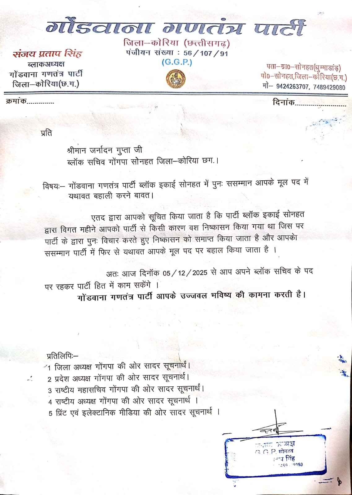 गोंडवाना गणतंत्र पार्टी ने जनार्दन गुप्ता को ब्लॉक सचिव पद पर किया बहाल, निष्कासन रद्द
