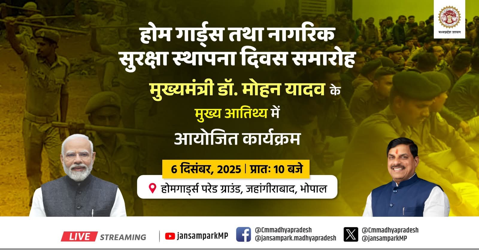 🎖️होम गार्ड्स एवं नागरिक सुरक्षा स्थापना दिवस समारोह 🗓️ 6 दिसंबर 📍 होमगार्ड्स परेड ग्राउंड, जहांगीराबाद, भोपाल ⏰ प्रातः 10 बजेDr Mohan Yadav #SDERF #HomeGuard