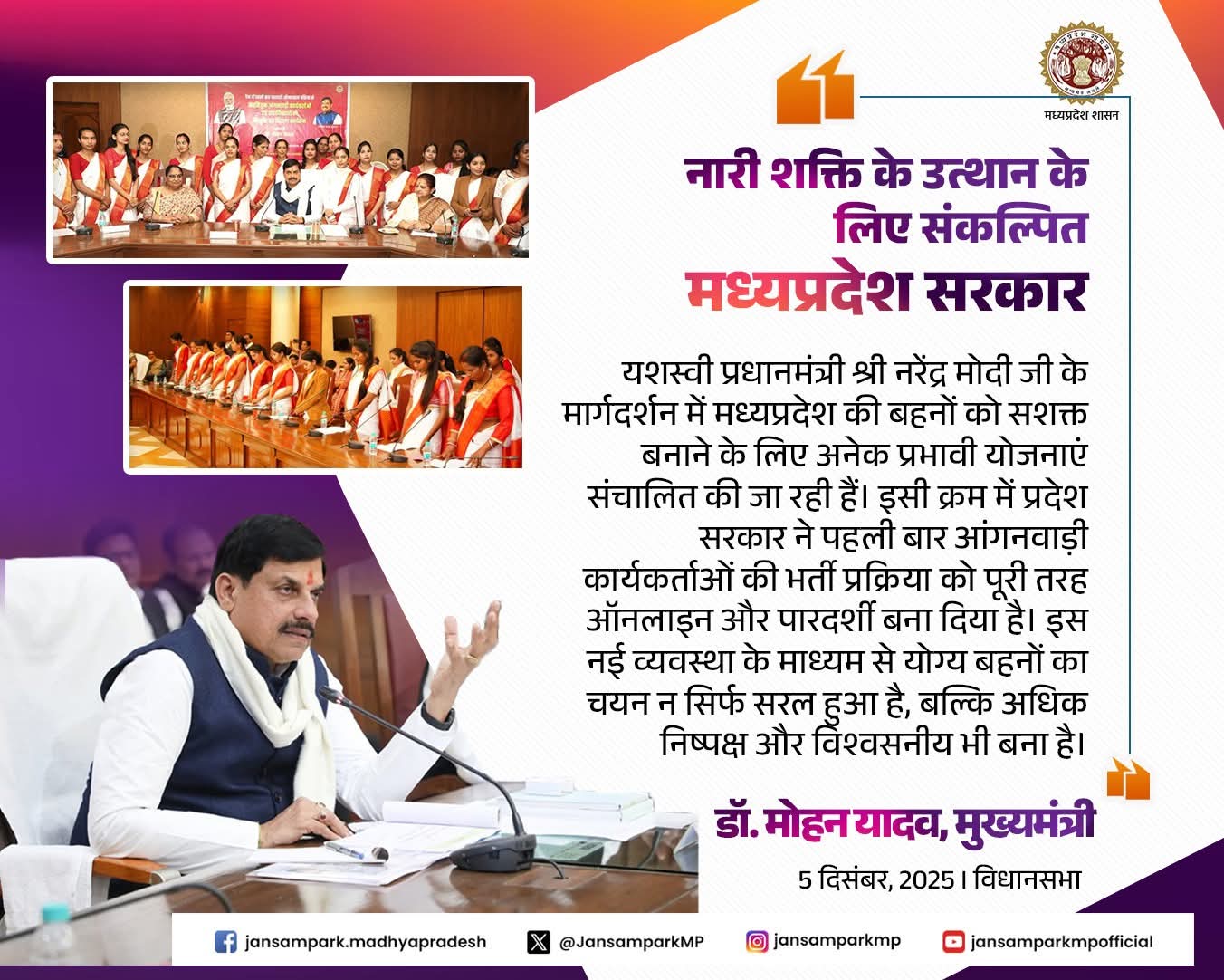 यशस्वी प्रधानमंत्री श्री नरेंद्र मोदी जी के मार्गदर्शन में मध्यप्रदेश की बहनों को सशक्त बनाने के लिए अनेक प्रभावी योजनाएं संचालित की जा रही हैं। इसी क्रम में प्रदेश सरकार ने पहली बार आंगनवाड़ी कार्यकर्ताओं की भर्ती प्रक्रिया को पूरी तरह ऑनलाइन और पारदर्शी बना दिया है। इस नई व्यवस्था के माध्यम से योग्य बहनों का चयन न सिर्फ सरल हुआ है, बल्कि अधिक निष्पक्ष और विश्वसनीय भी बना है।