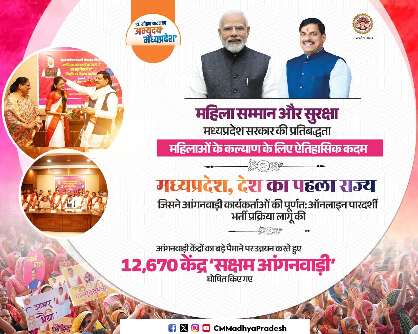 मध्यप्रदेश, देश का पहला राज्य जिसने आंगनवाड़ी कार्यकर्ताओं की पूर्णत: ऑनलाइन पारदर्शी भर्ती प्रकिया लागू की।