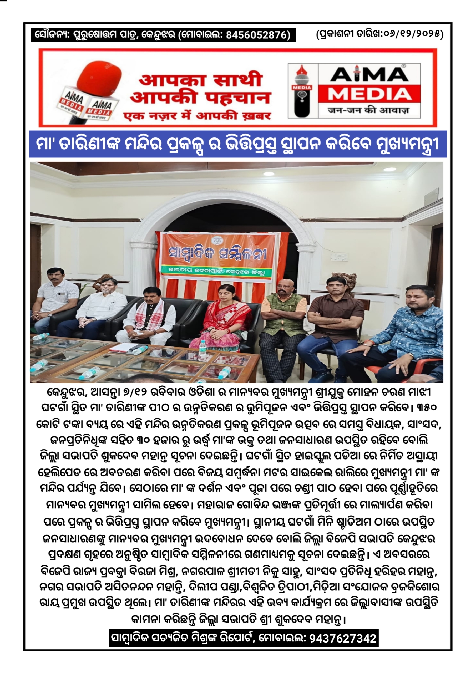 କେନ୍ଦୁଝର, ଆସନ୍ତା ରବିବାର ଓଡିଶା ର ମାନ୍ୟବର ମୁଖ୍ୟମନ୍ତ୍ରୀ ଶ୍ରୀଯୁକ୍ତ ମୋହନ ଚରଣ ମାଝୀ ଘଟଗାଁ ସ୍ଥିତ ମା' ତାରିଣୀଙ୍କ ପୀଠ ର ଉନ୍ନତିକରଣ ର ଭୁମିପୂଜନ ଏବଂ ଭିତ୍ତିପ୍ରସ୍ତ ସ୍ଥାପନ କରିବେ। ୩୫୦ କୋଟି ଟଙ୍କା ବ୍ୟୟ ରେ ଏହି ମନ୍ଦିର ଉନ୍ନତିକରଣ ପ୍ରକଳ୍ପ ଭୂମିପୂଜନ ଉତ୍ସବ ରେ ସମସ୍ତ ବିଧାୟକ,ସାଂସଦ,ଜନପ୍ରତିନିଧିଙ୍କ ସହିତ ୩୦ ହଜାର ରୁ ଉର୍ଧ୍ଵ ମା'ଙ୍କ ଭକ୍ତ ତଥା ଜନସାଧାରଣ ଉପସ୍ଥିତ ରହିବେ ବୋଲି ଜିଲ୍ଲା ସଭାପତି ଶୁକଦେବ ମହାନ୍ତ ସୂଚନା ଦେଇଛନ୍ତି। ଘଟଗାଁ ସ୍ଥିତ ହାଇସ୍କୁଲ ପଡିଆ ରେ ନିର୍ମିତ ଅସ୍ଥାୟୀ ହେଲିପେଡ ରେ ଅବତରଣ କରିବା ପରେ ବିଜୟ ସମ୍ବର୍ଦ୍ଧନା ମଟର ସାଇକେଲ ରାଲିରେ ମୁଖ୍ୟମନ୍ତ୍ରୀ ମା' ଙ୍କ ମନ୍ଦିର ପର୍ଯ୍ୟନ୍ତ ଯିବେ। ସେଠାରେ ମା' ଙ୍କ ଦର୍ଶନ ଏବଂ ପୂଜା ପରେ ଚଣ୍ଡୀ ପାଠ ହେବା ପରେ ପୂର୍ଣ୍ଣାହୂତିରେ ମାନ୍ୟବର ମୁଖ୍ୟମନ୍ତ୍ରୀ ସାମିଲ ହେବେ। ମହାରାଜ ଗୋବିନ୍ଦ ଭଞ୍ଜଙ୍କ ପ୍ରତିମୂର୍ତ୍ତୀ ରେ ମାଲ୍ୟାର୍ପଣ କରିବା ପରେ ପ୍ରକଳ୍ପ ର ଭିତ୍ତିପ୍ରସ୍ତ ସ୍ଥାପନ କରିବେ ମୁଖ୍ୟମନ୍ତ୍ରୀ। ସ୍ଥାନୀୟ ଘଟଗାଁ ମିନି ଷ୍ଟାଡିଅମ ଠାରେ ଉପସ୍ଥିତ ଜନସାଧାରଣଙ୍କୁ ମାନ୍ୟବର ମୁଖ୍ୟମନ୍ତ୍ରୀ ଉଦବୋଧନ ଦେବେ ବୋଲି ଜିଲ୍ଲା ବିଜେପି ସଭାପତି କେନ୍ଦୁଝର ପ୍ରଦକ୍ଷଣ ଗୃହରେ ଅନୁଷ୍ଠିତ ସାମ୍ବାଦିକ ସମ୍ମିଳନୀରେ ଗଣମାଧ୍ୟମକୁ ସୂଚନା ଦେଇଛନ୍ତି। ଏ ଅବସରରେ ବିଜେପି ରାଜ୍ୟ ପ୍ରବକ୍ତା ବିରଜା ମିଶ୍ର, ନଗରପାଳ ଶ୍ରୀମତୀ ନିକୁ ସାହୁ, ସାଂସଦ ପ୍ରତିନିଧି ହରିହର ମହାନ୍ତ,ନଗର ସଭାପତି ଅସିତନନ୍ଦନ ମହାନ୍ତି, ଦିଲୀପ ପଣ୍ଡା,ବିଶ୍ୱଜିତ ତ୍ରିପାଠୀ,ମିଡ଼ିଆ ସଂଯୋଜକ ବ୍ରଜକିଶୋର ରାୟ ପ୍ରମୁଖ ଉପସ୍ଥିତ ଥିଲେ। ମା' ତାରିଣୀଙ୍କ ମନ୍ଦିରର ଏହି ଭବ୍ୟ କାର୍ଯ୍ୟକ୍ରମ ରେ ଜିଲ୍ଲାବାସୀଙ୍କ ଉପସ୍ଥିତି କାମନା କରିଛନ୍ତି ଜିଲ୍ଲା ସଭାପତି ଶ୍ରୀ ଶୁକଦେବ ମହାନ୍ତ।