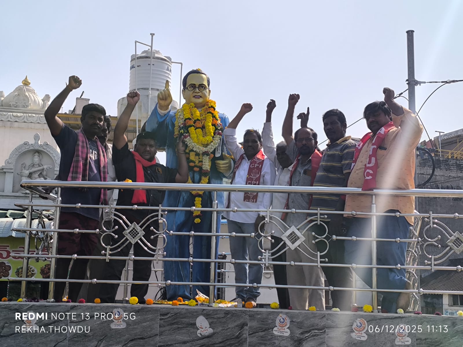 నవభారత రాజ్యాంగ నిర్మాత బడుగు బలహీన వర్గాల ఆశాజ్యోతి. న్యాయ కోవిదుడు, ఆర్థికవేత్త రాజనీతిజ్ఞుడు, డాక్టర్ బాబాసాహెబ్ అంబేద్కర్ గారి 69వ వర్ధంతి కార్యక్రమాన్ని బొబ్బిలి పట్టణంలో ఉన్నటువంటి తారకరామ కాలనీ లో ఉన్న అంబేద్కర్ గారి విగ్రహం వద్ద భారత కమ్యూనిస్టు పార్టీ సిపిఐ ఆధ్వర్యంలో ఘనంగా నివాళులర్పించడం జరిగింది. ముందుగా అంబేద్కర్ గారి విగ్రహానికి పూలమాల వేసి నివాళులర్పిస్తూ ఈ కార్యక్రమానికి ముఖ్యఅతిథిగా విచ్చేసిన సిపిఐ పార్టీ జిల్లా కార్యదర్శి ఒమ్మి రమణ మాట్లాడుతూ బిజెపి నాయకత్వంలోని కేంద్ర ప్రభుత్వం ఎస్సీ, ఎస్టీ బీసీ మైనార్టీ వర్గాలు ప్రజలు ప్రాథమిక హక్కులకు, ఉద్యోగ ఉపాధి అవకాశాలకు తీవ్ర విఘాతం కలిగించడమే కాకుండా, రాజ్యాంగ మనుగడకు, దేశ సమగ్రతకు ప్రమాదం ఏర్పడిందని ఆందోళన వ్యక్తం చేశారు. భారత రాజ్యాంగం కల్పించిన హక్కులను అణగారిన వర్గాలకు అందించడంలో పాలక ప్రభుత్వాలు పూర్తిగా విఫలం చెందాయని. ఇప్పటికి దళిత మైనారిటీ గిరిజనులపై హత్యలు హత్యాచారాలు జరుగుతూనే ఉన్నాయని. ఎస్సీ ఎస్టీ అట్రాసిటీ చట్టం పూర్తి స్థాయిలో అమలు కాకపోవడం వలన అనగారిన వర్గాలపై దాడులు మరింత ఎక్కువ అయ్యాయని. బిజెపి ప్రభుత్వం భారత రాజ్యాంగాన్ని. ఎస్సీ ఎస్టీ అట్రాసిటీ చట్టాన్ని పూర్తిగా నిర్వీర్యం చేయడానికి మోడీ. అమిత్షాలు కంకణం కట్టుకున్నారని. గిరిజనుల సంపద అయినటువంటి అటవీ భూముల్లో ఉన్నటువంటి అపారమైన ఖనిజ సంపదను కార్పొరేట్ శక్తులకు దారా దత్తం చేయడానికి ఆపరేషన్ కగారు పేరుతో మావోయిస్టులను బూటకపు ఎన్కౌంటర్లు చేస్తుందని అన్నారు. మన దేశంపై బాంబుదాడులు చేస్తున్న తీవ్రవాదులను పట్టుకుని వారికి సకల సౌకర్యాలు కల్పిస్తున్న పాలకులు. మన భారతదేశ పౌరులు అయినటువంటి మావోయిస్టులు తుపాకీ వీడి చర్చలకు వస్తామని చెప్పిన అవేవీ పట్టించుకోకుండా అడవుల నుండి గిరిజనులను పూర్తిగా తరిమివేసి అపారమైన కనిజ సంపదను దోచుకోవడానికి అర్బన్ లక్సలైట్ల పేరుతో అమాయకపు గిరిజనులను చంపుతున్నారని అన్నారు. ఇప్పటికైనా డాక్టర్ బాబాసాహెబ్ అంబేద్కర్ కల్పించిన రాజ్యాంగ హక్కులు కాపాడుకోవడం కోసం ప్రజలందరూ భవిష్యత్తులో జరిగే పోరాటాలకు సహకరించాలని కోరారు. ఈ కార్యక్రమంలో సిపిఐ జిల్లా కార్యవర్గ సభ్యులు మునకాల శ్రీనివాస్. కోట అప్పన్న. దళిత హక్కుల పోరాట సమితి బొబ్బిలి పట్టణ కార్యదర్శి గొల్లపల్లి తౌడు. సిపిఐ పట్టణ నాయకులు నాయకులు పొడుగు అశోక్. పులుసు వెంకట సత్యనారాయణ. పాలూరి కృష్ణ. తదితరులు పాల్గొన్నారు