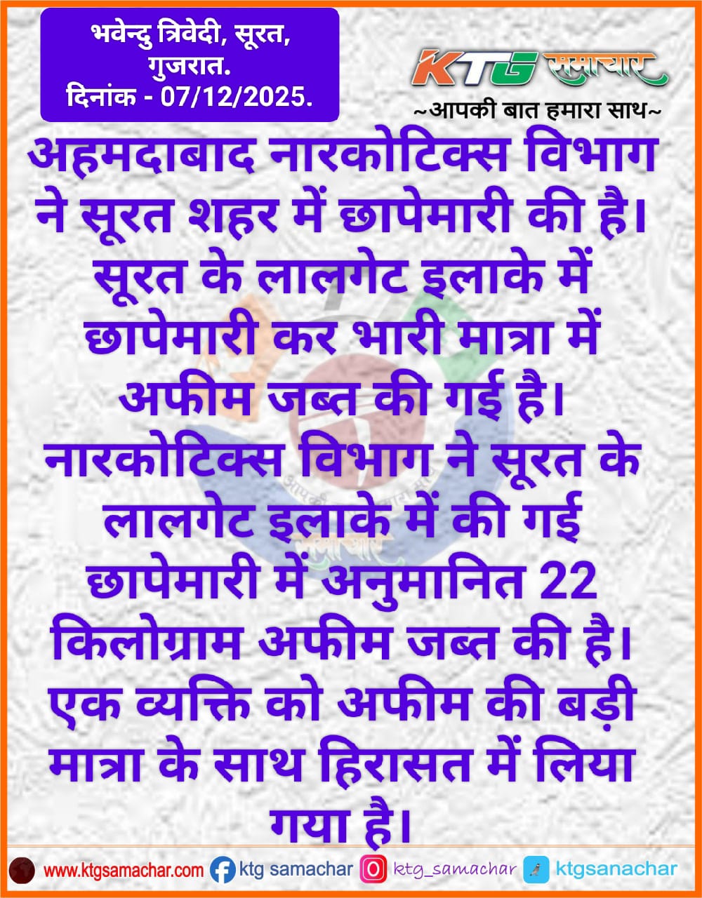 सूरत के लालगेट इलाके में छापेमारी कर भारी मात्रा में अफीम जप्त की गई है।