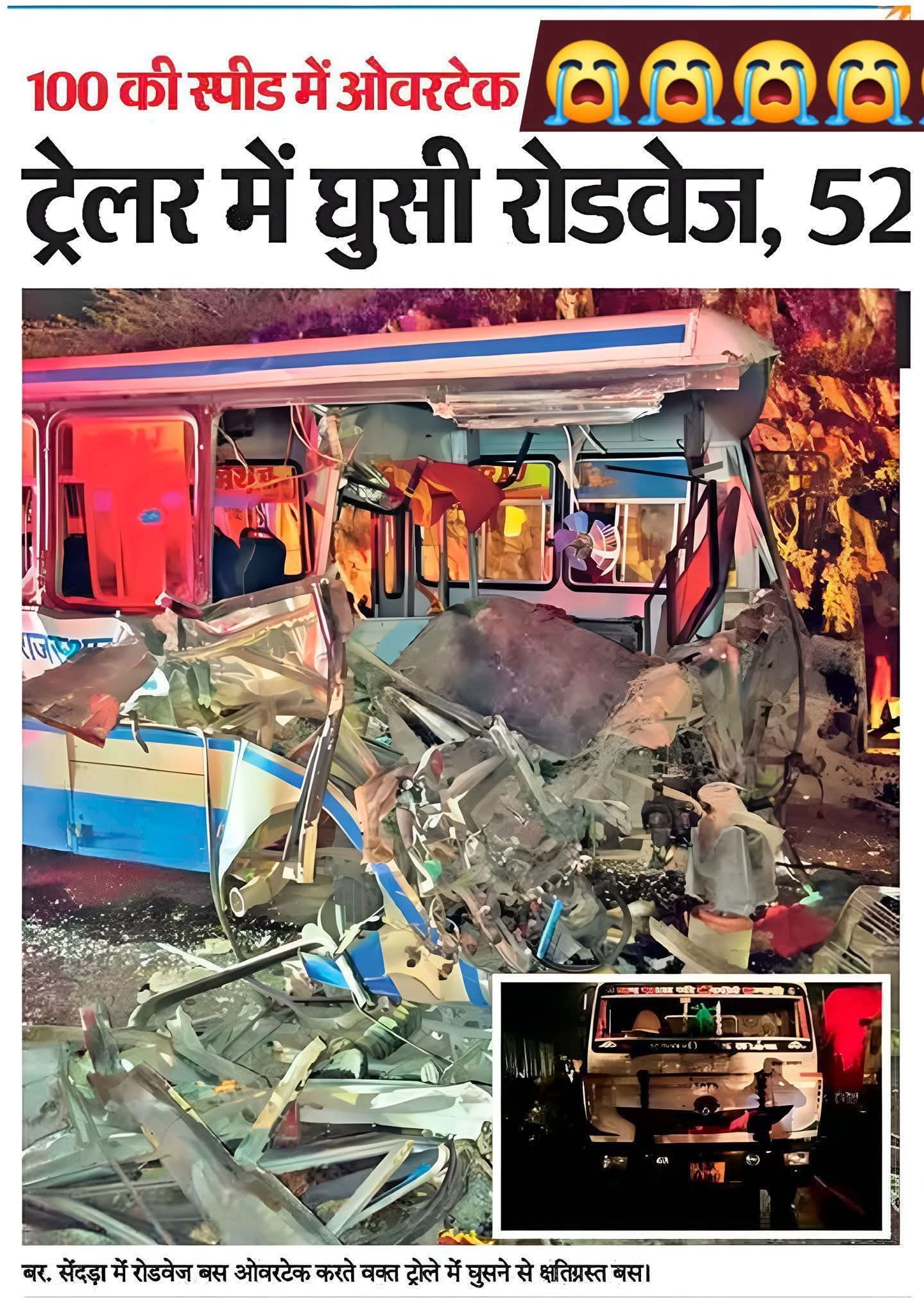 ओवरटेक में रोडवेज बस ट्रेलर में घुसी, 27 यात्री घायल 😢**