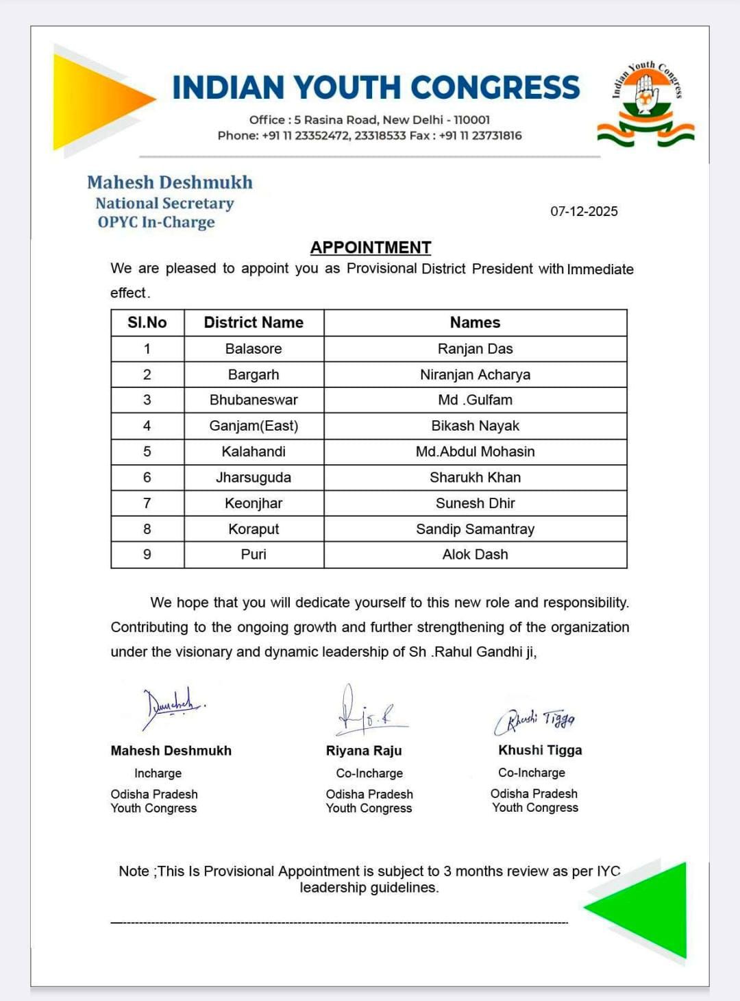 ୩ୟ ଥର ପାଇଁ ସୁନେଶ ଧୀର ଜ଼ିଲ୍ଲା ଯୁବ କଂଗ୍ରେସର ସଭାପତି ନିଯୁକ୍ତ