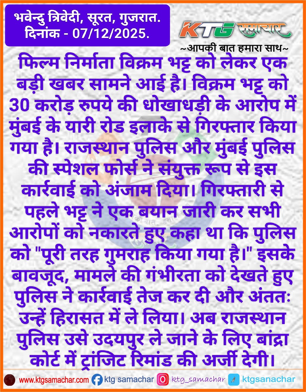 फिल्म निर्माता विक्रम भट्ट धोखाधड़ी के आरोप मे गिरफ्तार।