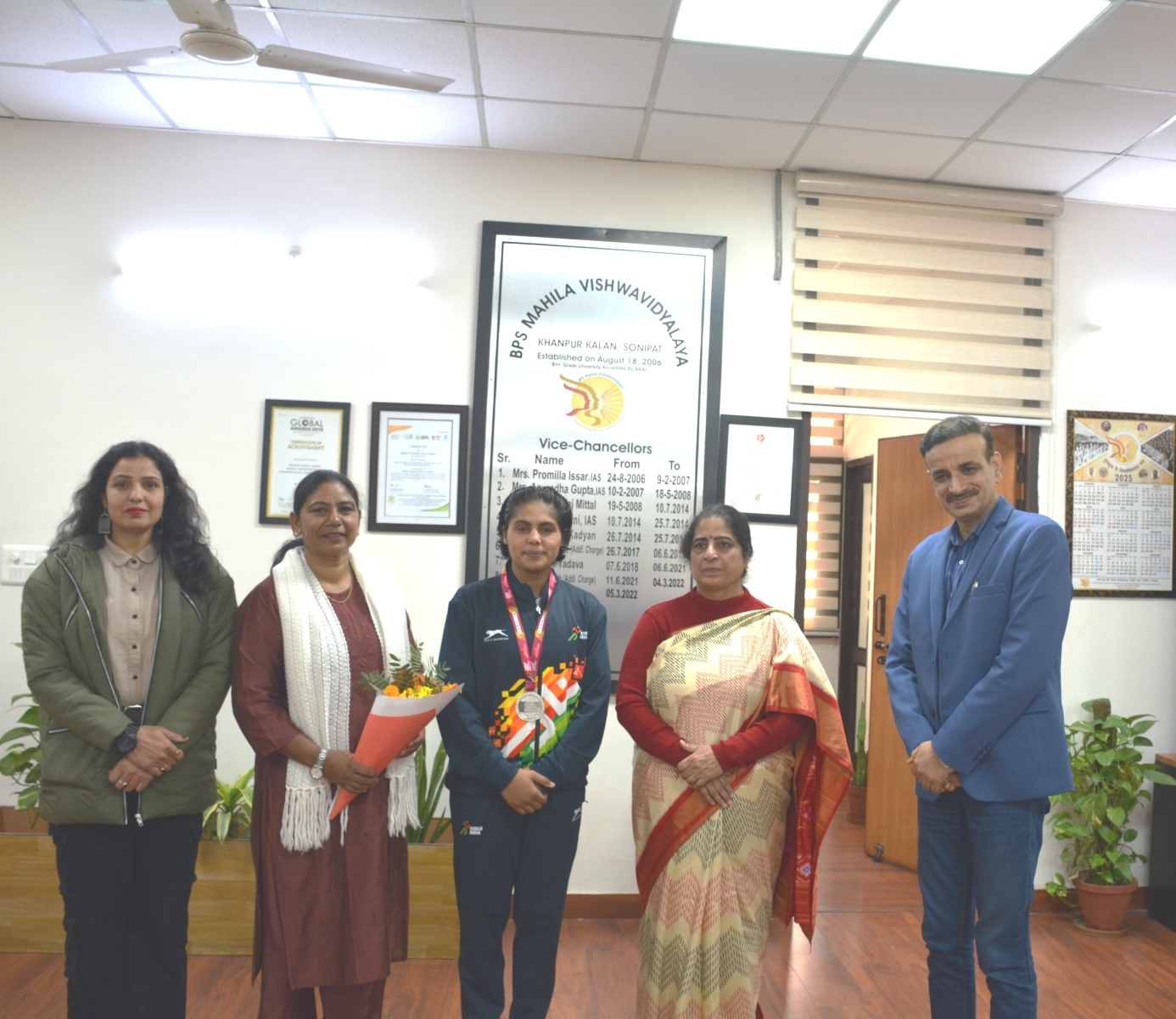फोटो कैप्शन : 1 खेलो इंडिया यूनिवर्सिटी गेम्स की मेडलिस्ट खिलाड़ी गरिमा, महिला विवि की कुलपति प्रो. सुदेश व कुलसचिव प्रो. शिवालिक यादव के साथ।