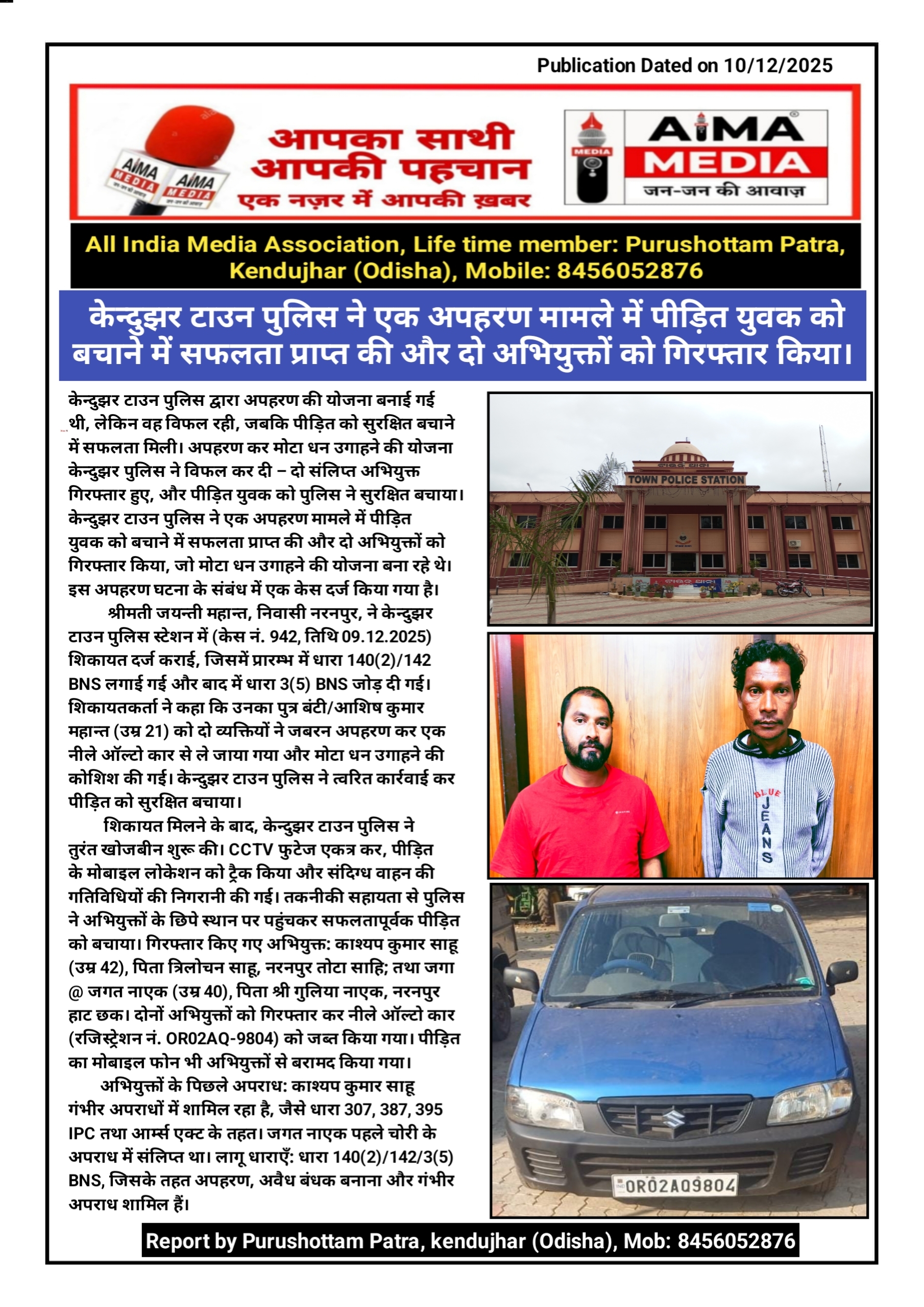 श्रीमती जयन्ती महान्त, निवासी नरनपुर, ने केन्दुझर टाउन पुलिस स्टेशन में (केस नं. 942, तिथि 09.12.2025) शिकायत दर्ज कराई, जिसमें प्रारम्भ में धारा 140(2)/142 BNS लगाई गई और बाद में धारा 3(5) BNS जोड़ दी गई। शिकायतकर्ता ने कहा कि उनका पुत्र बंटी/आशिष कुमार महान्त (उम्र 21) को दो व्यक्तियों ने जबरन अपहरण कर एक नीले ऑल्टो कार से ले जाया गया और मोटा धन उगाहने की कोशिश की गई। केन्दुझर टाउन पुलिस ने त्वरित कार्रवाई कर पीड़ित को सुरक्षित बचाया।