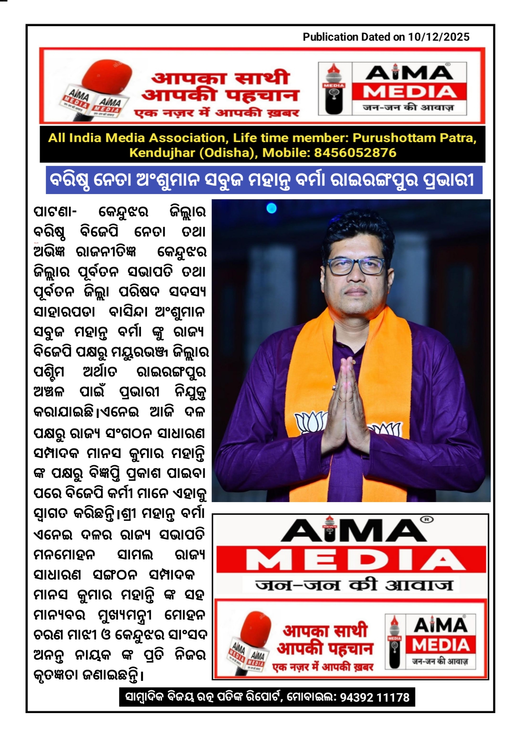 ପାଟଣା-କେନ୍ଦୁଝର ଜିଲ୍ଲାର ବରିଷ୍ଠ ବିଜେପି ନେତା ତଥା ଅଭିଜ୍ଞ ରାଜନୀତିଜ୍ଞ କେନ୍ଦୁଝର ଜିଲ୍ଲାର ପୂର୍ବତନ ସଭାପତି ତଥା ପୂର୍ବତନ ଜିଲ୍ଲା ପରିଷଦ ସଦସ୍ୟ ସାହାରପଡା ବାସିନ୍ଦା ଅଂଶୁମାନ ସବୁଜ ମହାନ୍ତ ବର୍ମା ଙ୍କୁ ରାଜ୍ୟ ବିଜେପି ପକ୍ଷରୁ ମୟୁରଭଞ୍ଜ ଜିଲ୍ଲାର ପଶ୍ଚିମ ଅର୍ଥାତ ରାଇରଙ୍ଗପୁର ଅଞ୍ଚଳ ପାଇଁ ପ୍ରଭାରୀ ନିଯୁକ୍ତ କରାଯାଇଛି।ଏନେଇ ଆଜି ଦଳ ପକ୍ଷରୁ ରାଜ୍ୟ ସଂଗଠନ ସାଧାରଣ ସମ୍ପାଦକ ମାନସ କୁମାର ମହାନ୍ତି ଙ୍କ ପକ୍ଷରୁ ବିଜ୍ଞପ୍ତି ପ୍ରକାଶ ପାଇବା ପରେ ବିଜେପି କର୍ମୀ ମାନେ ଏହାକୁ ସ୍ୱାଗତ କରିଛନ୍ତି। ଶ୍ରୀ ମହାନ୍ତ ବର୍ମା ଏନେଇ ଦଳର ରାଜ୍ୟ ସଭାପତି ମନମୋହନ ସାମଲ ରାଜ୍ୟ ସାଧାରଣ ସଙ୍ଗଠନ ସମ୍ପାଦକ ମାନସ କୁମାର ମହାନ୍ତି ଙ୍କ ସହ ମାନ୍ୟବର ମୁଖ୍ୟମନ୍ତ୍ରୀ ମୋହନ ଚରଣ ମାଝୀ ଓ କେନ୍ଦୁଝର ସାଂସଦ ଅନନ୍ତ ନାୟକ ଙ୍କ ପ୍ରତି ନିଜର କୃତଜ୍ଞତା ଜଣାଇଛନ୍ତି।