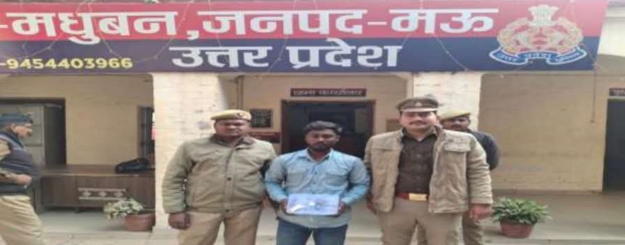मधुबन(मऊ):-स्थानीय पुलिस ने सोमवार की देर रात संदिग्धों की चेकिंग के दौरान ह्रदयपट्टी गांव के बाहर पुलिया के पास से एक युवक को अवैध तमंचा व जिंदा कारतूस के साथ गिरफ्तार किया। आरोपी के खिलाफ आर्म्स एक्ट के तहत मुकदमा दर्ज कर उसे जेल भेज दिया गया है। पुलिस अधीक्षक इलामारन के निर्देश पर अपराध नियंत्रण के लिए चलाए जा रहे अभियान के क्रम में अपर पुलिस अधीक्षक व क्षेत्राधिकारी अभय कुमार सिंह के कुशल निर्देशन में स्थानीय थाना की पुलिस टीम ने सोमवार देर रात चेकिंग अभियान चलाया। इसी दौरान मुखबिर की सूचना पर ग्राम ह्रदयपट्टी के बाहर पुलिया के पास से एक संदिग्ध युवक को रोका गया। जांच के दौरान आरोपी के पास से एक अवैध तमंचा 315 बोर तथा एक अदद जिंदा कारतूस बरामद हुआ। पूछताछ में युवक ने अपना नाम शैल कुमार पुत्र स्व० राम भवन निवासी ग्राम ह्रदयपट्टी थाना मधुबन बताया। आरोपी को मौके पर ही गिरफ्तार कर थाने लाया गया तथा प्राथमिकी दर्ज किया गया।