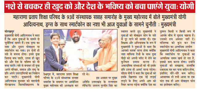 महाराणा प्रताप शिक्षा परिषद के 93 वें संस्थापक सप्ताह समारोह मुख्य महोत्सव में मुख्यमंत्री योगी आदित्यनाथ ने संबोधन में कहा कि कहा कि नशे से बचकर ही खुद को और देश के भविष्य को बचा पाएंगे युवा।