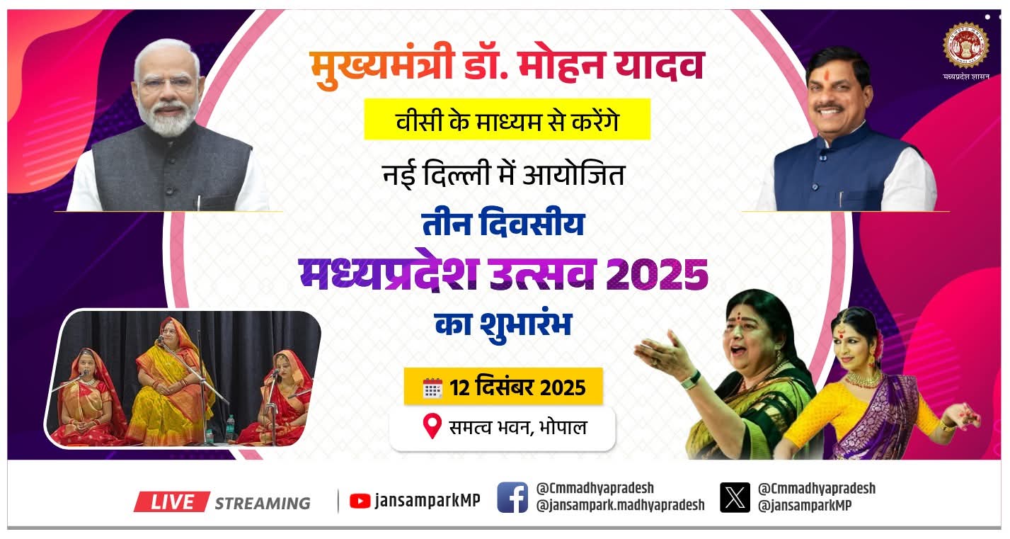 मुख्यमंत्री डॉ मोहन यादव वीसी के माध्यम से नई दिल्ली में आयोजित तीन दिवसीय मध्यप्रदेश उत्सव 2025 का शुभारंभ करेंगे।