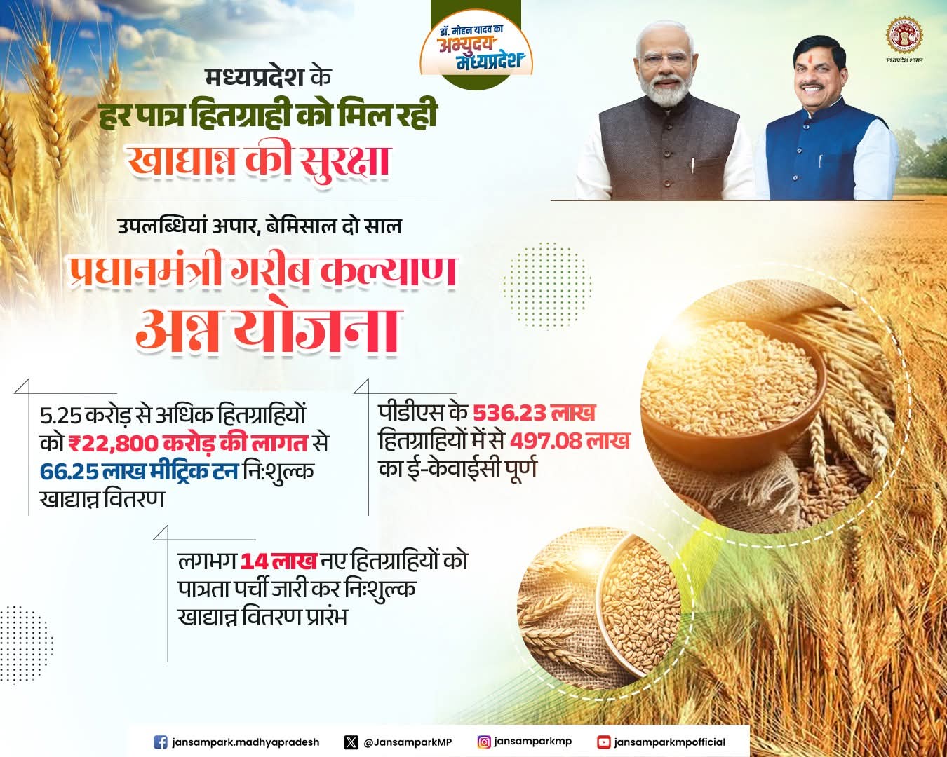 5.25 करोड़ से अधिक हितग्राहियों को ₹22,800 करोड़ की लागत से 66.25 लाख मीट्रिक टन नि:शुल्क खाद्यान्न वितरण