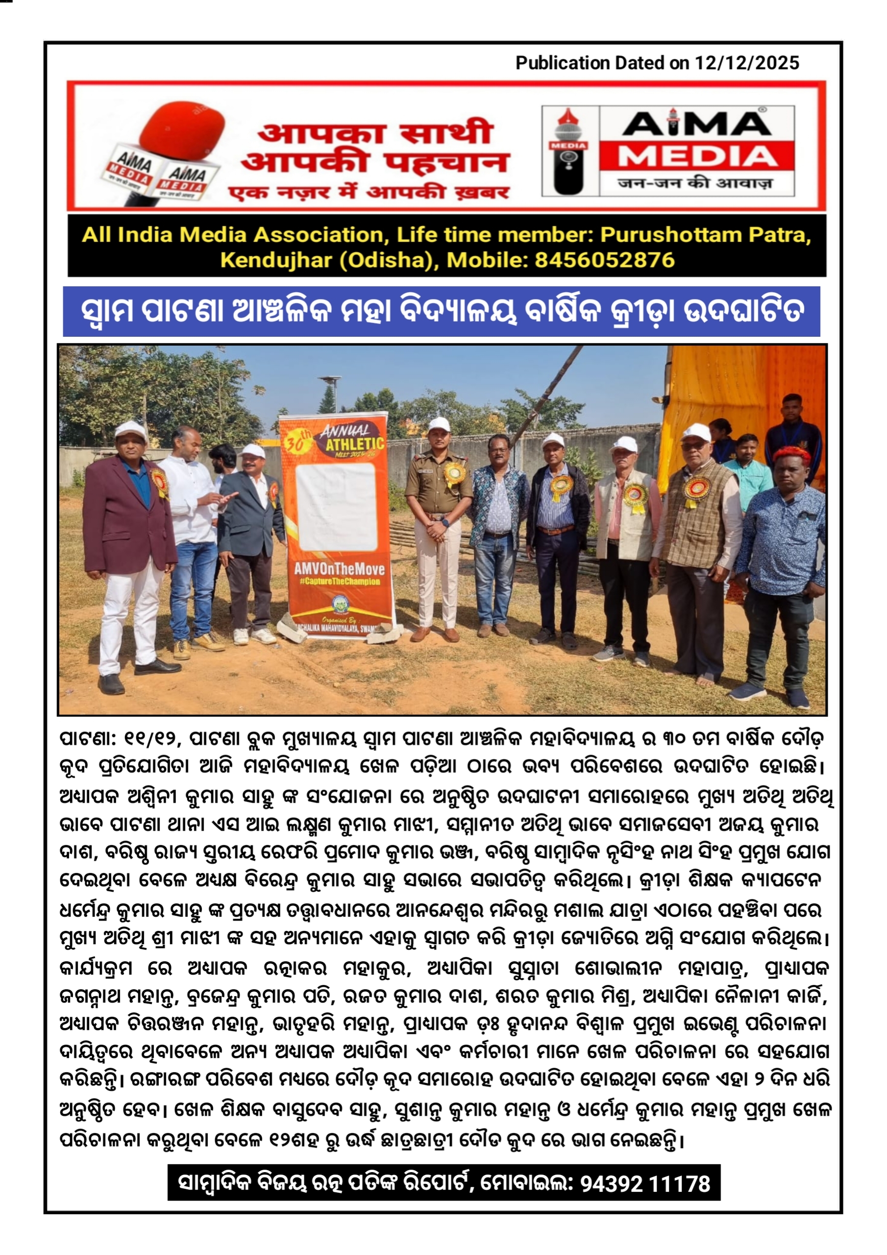 ପାଟଣା ୧୧/୧୨,ପାଟଣା ବ୍ଲକ ମୁଖ୍ୟାଳୟ ସ୍ୱାମ ପାଟଣା ଆଞ୍ଚଳିକ ମହାବିଦ୍ୟାଳୟ ର ୩୦ ତମ ବାର୍ଷିକ ଦୌଡ଼ କୂଦ ପ୍ରତିଯୋଗିତା ଆଜି ମହାବିଦ୍ୟାଳୟ ଖେଳ ପଡ଼ିଆ ଠାରେ ଭବ୍ୟ ପରିବେଶରେ ଉଦଘାଟିତ ହୋଇଛି। ଅଧ୍ୟାପକ ଅଶ୍ୱିନୀ କୁମାର ସାହୁ ଙ୍କ ସଂଯୋଜନା ରେ ଅନୁଷ୍ଠିତ ଉଦଘାଟନୀ ସମାରୋହରେ ମୁଖ୍ୟ ଅତିଥି ଅତିଥି ଭାବେ ପାଟଣା ଥାନା ଏସ ଆଇ ଲକ୍ଷ୍ମଣ କୁମାର ମାଝୀ, ସମ୍ମାନୀତ ଅତିଥି ଭାବେ ସମାଜସେବୀ ଅଜୟ କୁମାର ଦାଶ, ବରିଷ୍ଠ ରାଜ୍ୟ ସ୍ତରୀୟ ରେଫରି ପ୍ରମୋଦ କୁମାର ଭଞ୍ଜ, ବରିଷ୍ଠ ସାମ୍ବାଦିକ ନୃସିଂହ ନାଥ ସିଂହ ପ୍ରମୁଖ ଯୋଗ ଦେଇଥିବା ବେଳେ ଅଧ୍ୟକ୍ଷ ଵିରେନ୍ଦ୍ର କୁମାର ସାହୁ ସଭାରେ ସଭାପତିତ୍ୱ କରିଥିଲେ। କ୍ରୀଡ଼ା ଶିକ୍ଷକ କ୍ୟାପଟେନ ଧର୍ମେନ୍ଦ୍ର କୁମାର ସାହୁ ଙ୍କ ପ୍ରତ୍ୟକ୍ଷ ତତ୍ତ୍ୱାବଧାନରେ ଆନନ୍ଦେଶ୍ୱର ମନ୍ଦିରରୁ ମଶାଲ ଯାତ୍ରା ଏଠାରେ ପହଞ୍ଚିବା ପରେ ମୁଖ୍ୟ ଅତିଥି ଶ୍ରୀ ମାଝୀ ଙ୍କ ସହ ଅନ୍ୟମାନେ ଏହାକୁ ସ୍ୱାଗତ କରି କ୍ରୀଡ଼ା ଜ୍ୟୋତିରେ ଅଗ୍ନି ସଂଯୋଗ କରିଥିଲେ।କାର୍ଯ୍ୟକ୍ରମ ରେ ଅଧ୍ୟାପକ ରତ୍ନାକର ମହାକୁର, ଅଧ୍ୟାପିକା ସୁସ୍ନାତା ଶୋଭାଲୀନ ମହାପାତ୍ର, ପ୍ରାଧ୍ୟାପକ ଜଗନ୍ନାଥ ମହାନ୍ତ, ବ୍ରଜେନ୍ଦ୍ର କୁମାର ପତି, ରଜତ କୁମାର ଦାଶ, ଶରତ କୁମାର ମିଶ୍ର, ଅଧ୍ୟାପିକା ନୈଳାନୀ କାର୍ଜି,ଅଧ୍ୟାପକ ଚିତ୍ତରଞ୍ଜନ ମହାନ୍ତ, ଭାତୃହରି ମହାନ୍ତ, ପ୍ରାଧ୍ୟାପକ ଡ଼ଃ ହୃଦାନନ୍ଦ ବିଶ୍ୱାଳ ପ୍ରମୁଖ ଇଭେଣ୍ଟ ପରିଚାଳନା ଦାୟିତ୍ୱରେ ଥିବାବେଳେ ଅନ୍ୟ ଅଧ୍ୟାପକ ଅଧ୍ୟାପିକା ଏବଂ କର୍ମଚାରୀ ମାନେ ଖେଳ ପରିଚାଳନା ରେ ସହଯୋଗ କରିଛନ୍ତି।ରଙ୍ଗାରଙ୍ଗ ପରିବେଶ ମଧ୍ୟରେ ଦୌଡ଼ କୂଦ ସମାରୋହ ଉଦଘାଟିତ ହୋଇଥିବା ବେଳେ ଏହା ୨ ଦିନ ଧରି ଅନୁଷ୍ଠିତ ହେବ। ଖେଳ ଶିକ୍ଷକ ବାସୁଦେବ ସାହୁ,ସୁଶାନ୍ତ କୁମାର ମହାନ୍ତ ଓ ଧର୍ମେନ୍ଦ୍ର କୁମାର ମହାନ୍ତ ପ୍ରମୁଖ ଖେଳ ପରିଚାଳନା କରୁଥିବା ବେଳେ ୧୨ଶହ ରୁ ଉର୍ଦ୍ଧ ଛାତ୍ରଛାତ୍ରୀ ଦୌଡ କୁଦ ରେ ଭାଗ ନେଇଛନ୍ତି।