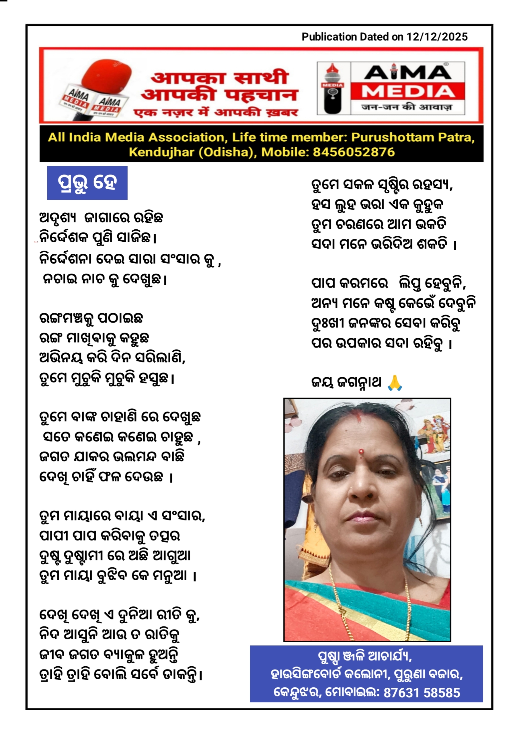ପୁଷ୍ପା ଞ୍ଜଳି ଆଚାର୍ଯ୍ୟ, ହାଉସିଙ୍ଗବୋର୍ଡ କଲୋନୀ, ପୁରୁଣା ବଜାର, କେନ୍ଦୁଝର, ମୋବାଇଲ: 87631 58585